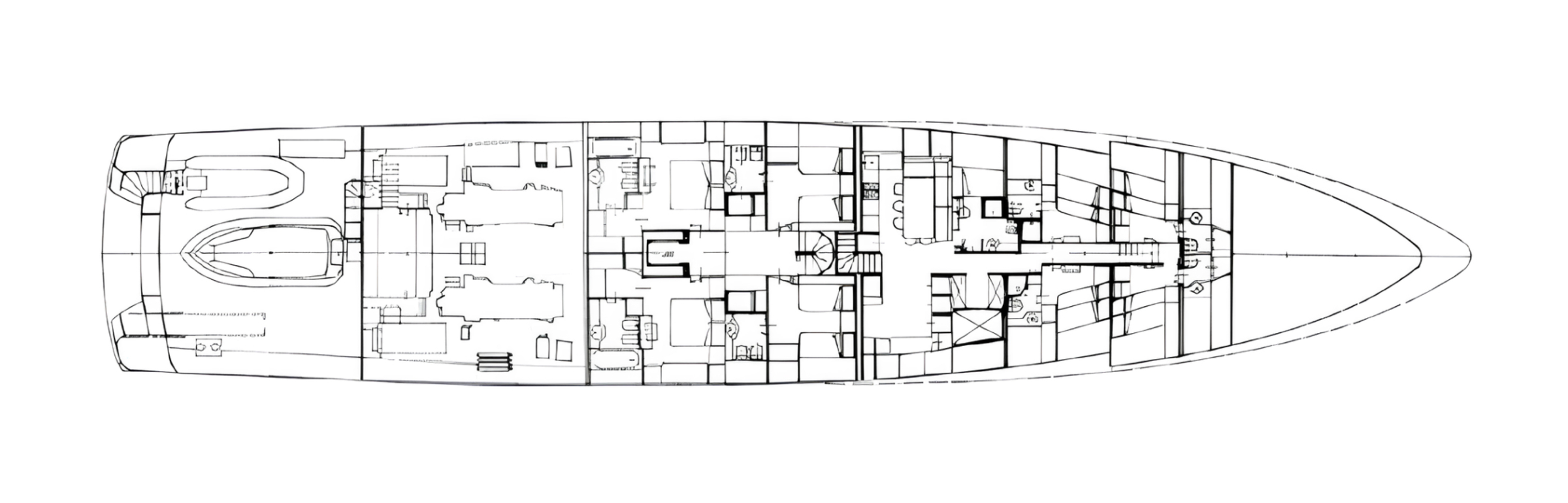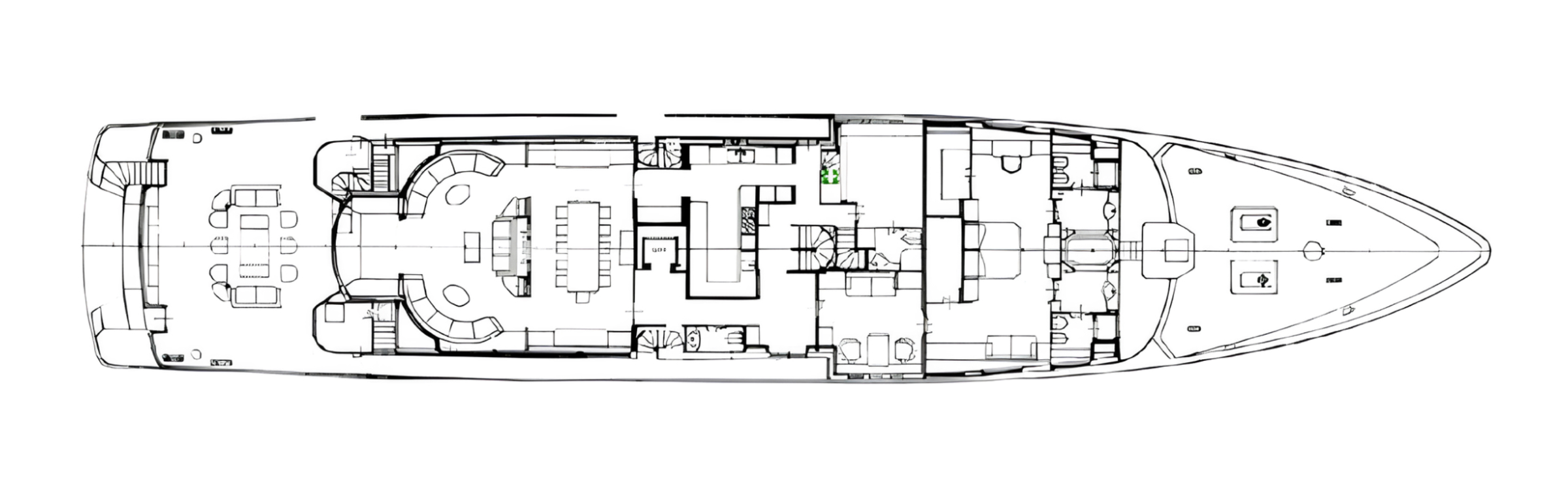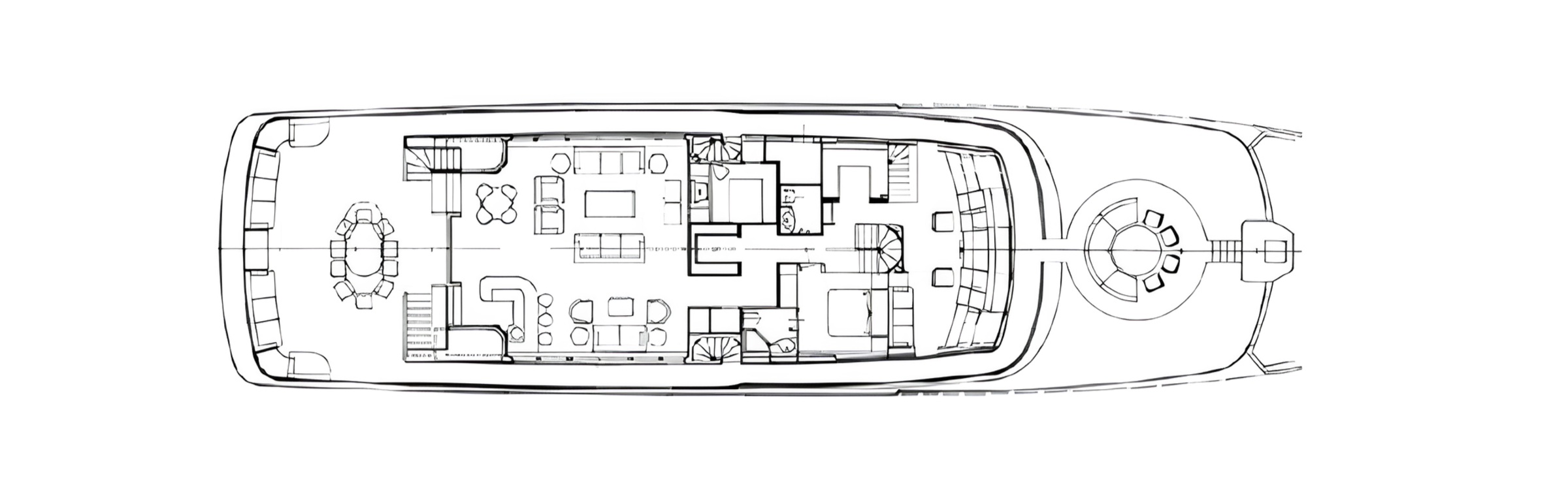 The sundeck is equipped with a jacuzzi, sunbathing areas, a bar, and sun canopies. The yacht’s mast includes an observation platform accessible via ladder, with integrated lift access.