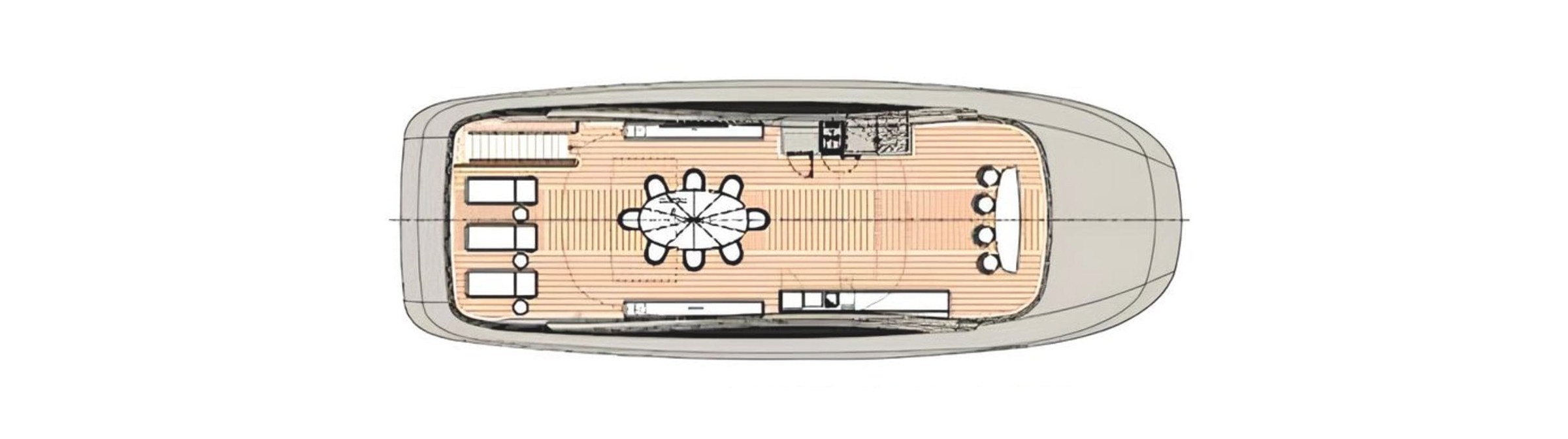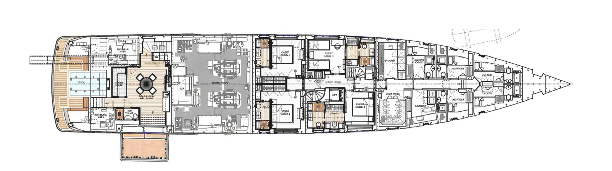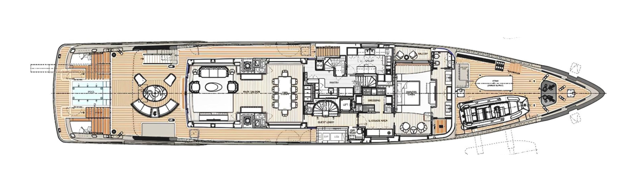 The yacht accommodates 10 guests in five staterooms, including a full-beam master suite with a private balcony, two VIP cabins, and two guest cabins on the lower deck, all with en-suite bathrooms. The upper deck features a lounge that can double as a media area. All decks are connected via an elevator. Additional features include a 36 m² beach club and a glass-bottom swimming pool.