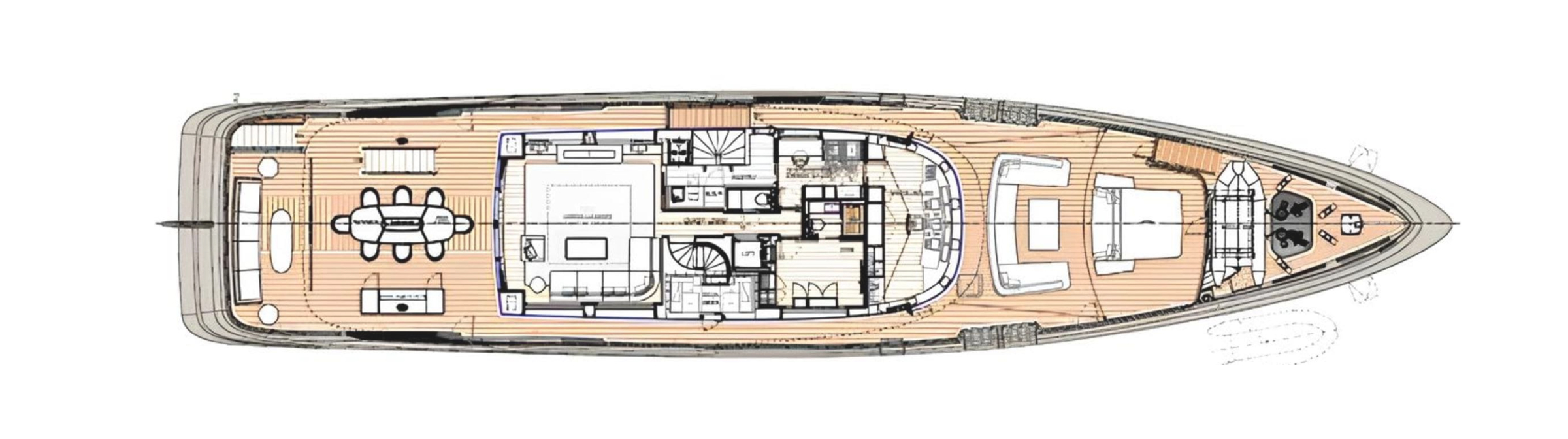 Her hull is constructed of steel with an aluminum superstructure and teak decks. The exterior is designed by RWD, while the interior is a collaboration between Salvagni Architetti and RWD. Powered by twin MAN V12 engines producing 1,380 hp each, she reaches a maximum speed of 15.6 knots and cruises comfortably at 12.5 knots, with a range of up to 4,500 nautical miles at 10 knots.