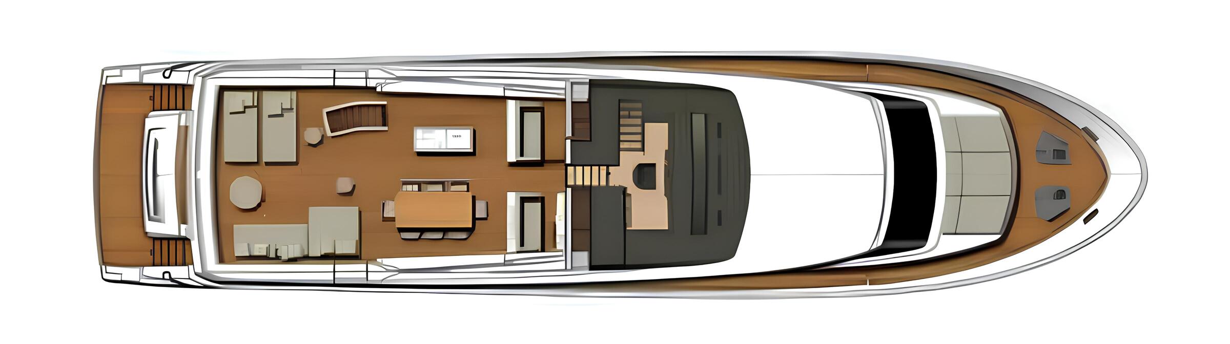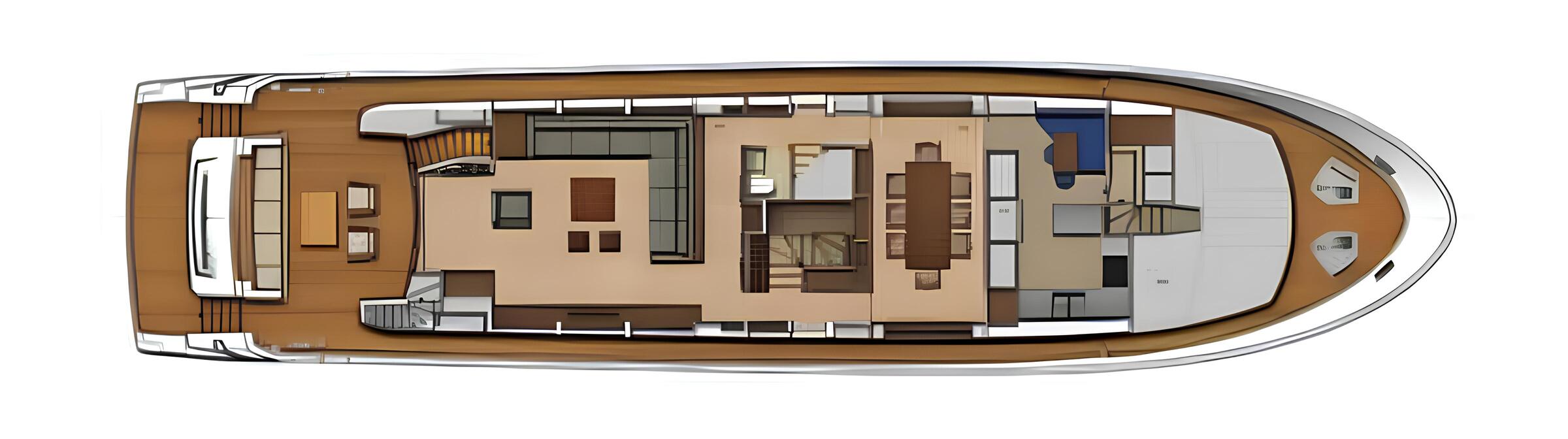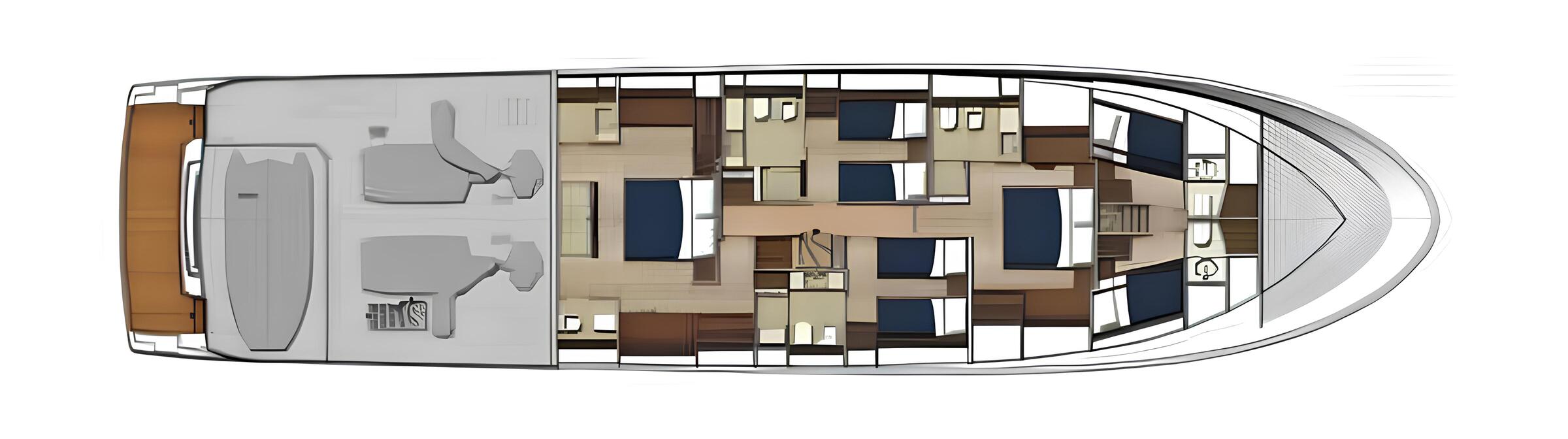 Her exterior decks include a spacious flybridge, aft cockpit and forward sunpads, offering multiple areas for lounging, sunbathing and al-fresco dining. Inside, a bright main salon with a dedicated dining area and a fully equipped galley create a welcoming environment for guests.