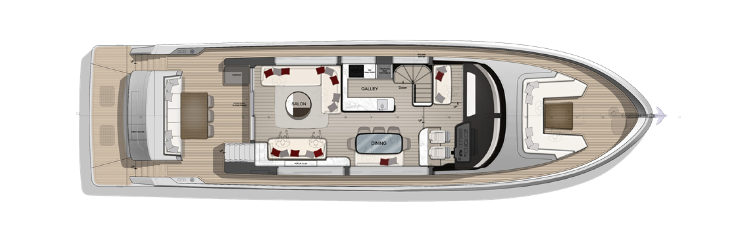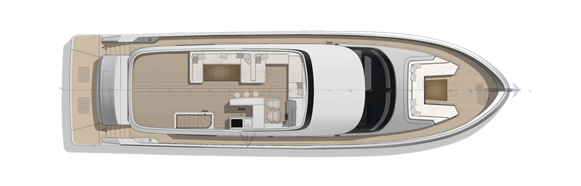 Expansive windows and an open-plan main deck seamlessly combine the salon, dining area, and galley, creating panoramic 360-degree views and a strong sense of connection with the sea. The flybridge provides an inviting space for alfresco dining and relaxation while cruising.