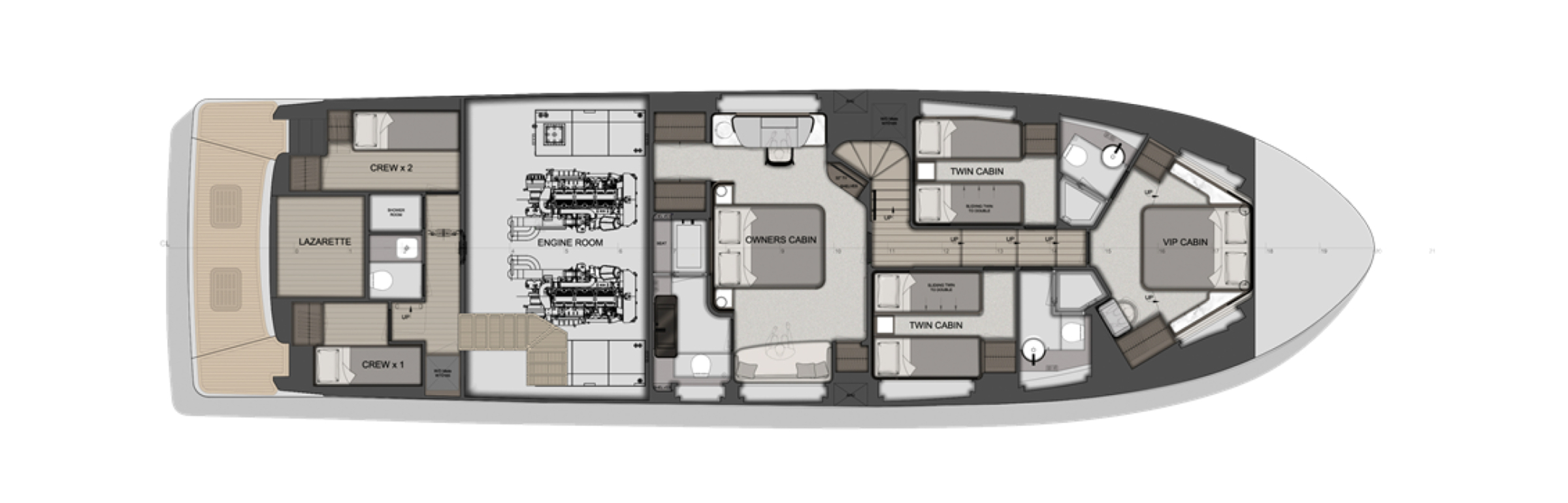 Accommodation is provided for eight guests in four cabins, along with two crew members in separate quarters. All guest cabins are decorated in soft, neutral tones with high-quality finishes and materials.