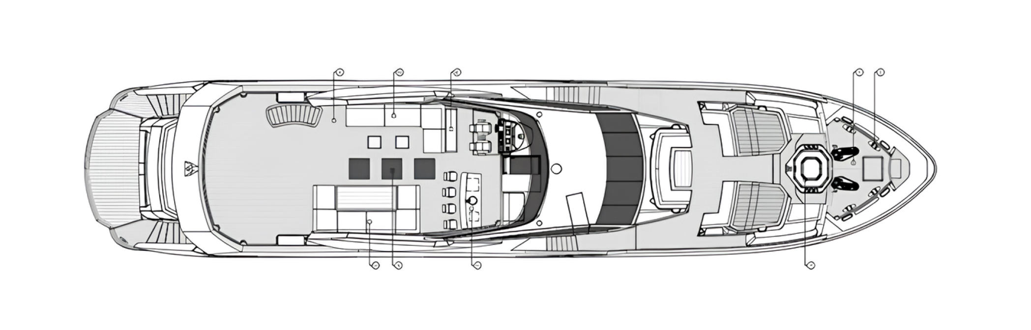 Outdoor spaces include a spacious flybridge with retractable sunshade, panoramic sunpads, a second bar and multiple lounge and dining areas. Forward, a private bow lounge features a Jacuzzi, sunpads and sofas.