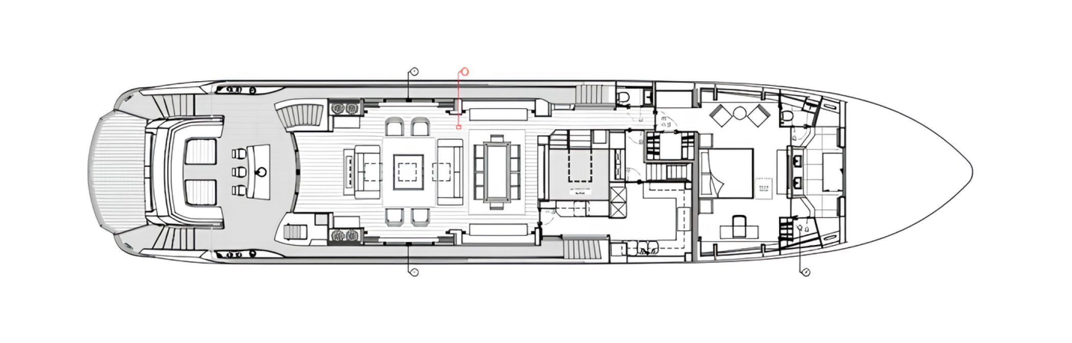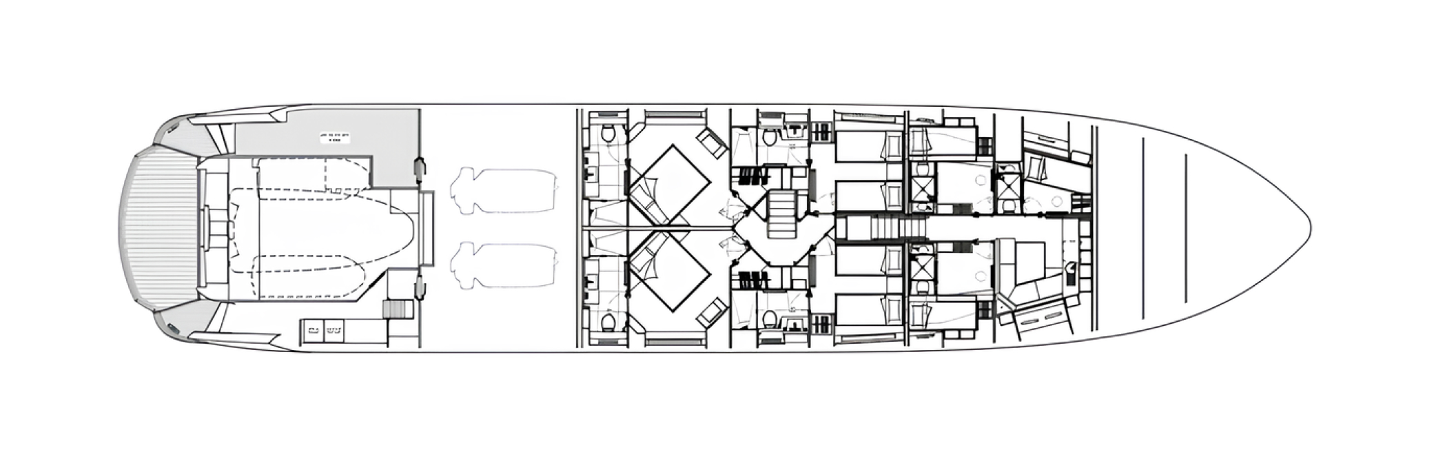 She accommodates up to 10 guests in five staterooms: a full-beam master suite on the main deck, two VIP staterooms and two twin cabins each with Pullman berths. The main salon, with its 180-degree floor-to-ceiling windows, skylights and sliding doors, flows seamlessly onto the aft deck. A stylish lounge with pop-up TV and a dining area for 10 guests create a welcoming ambience, while a bar connecting directly to the aft deck enhances the indoor–outdoor lifestyle.
