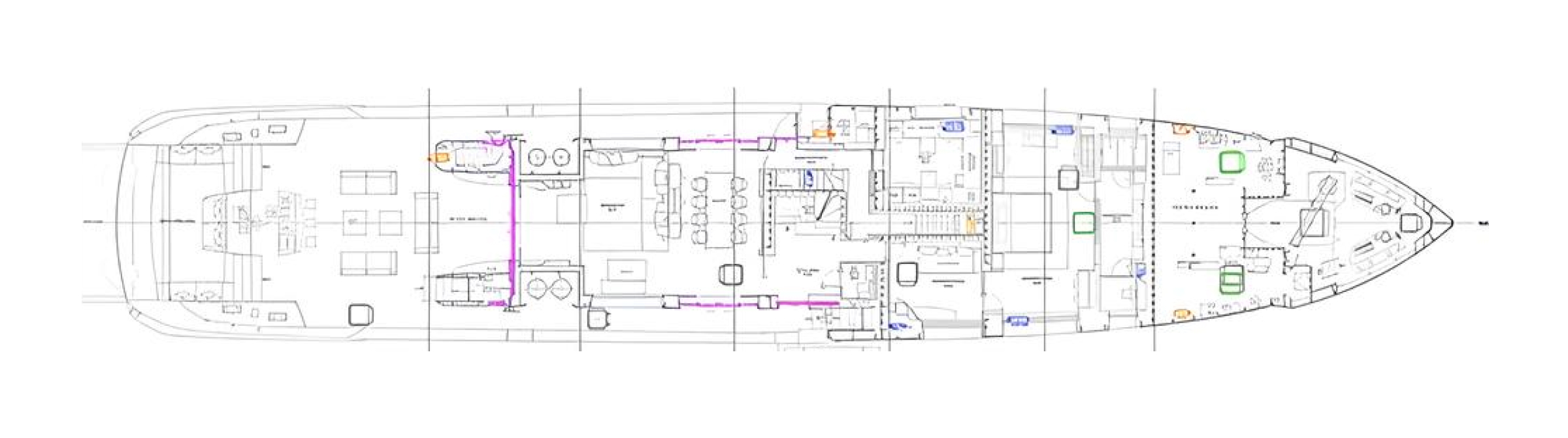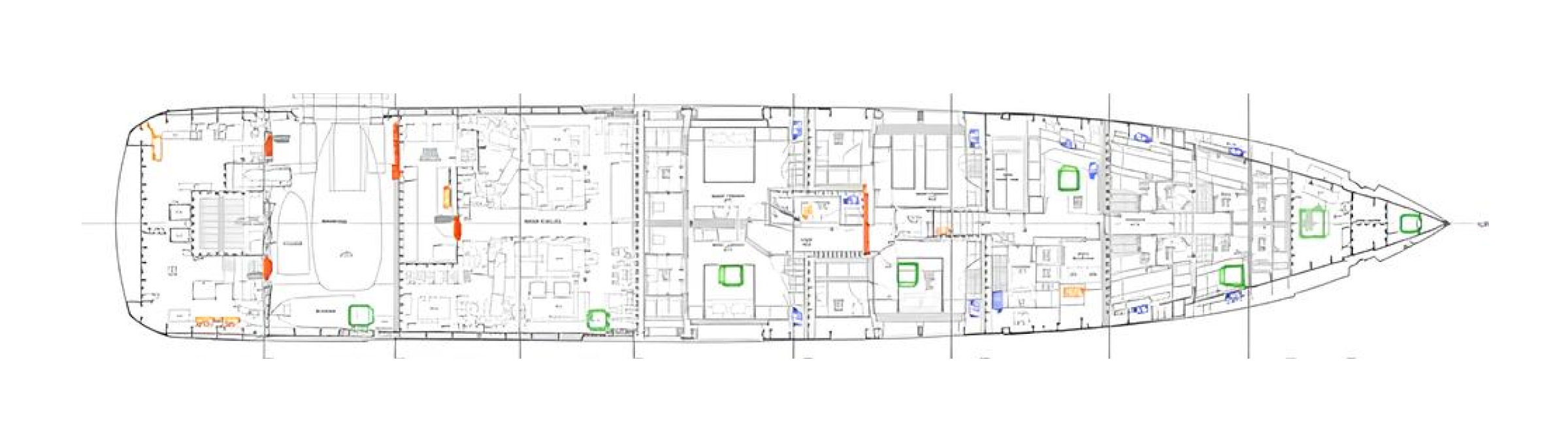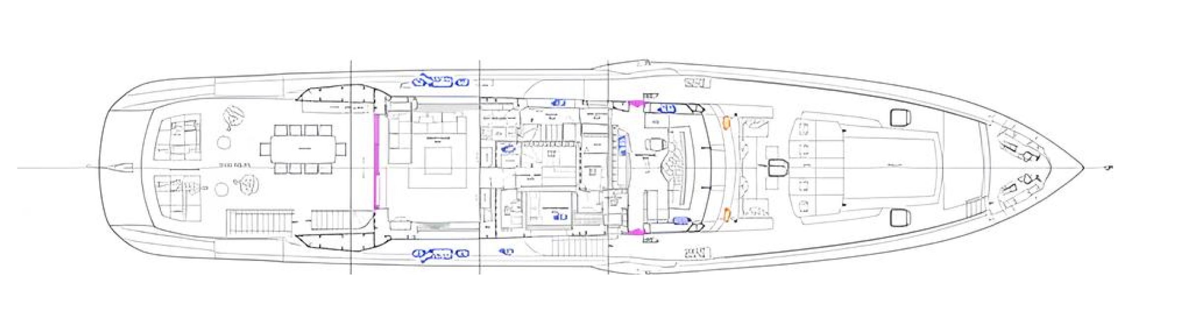 NO STRESS features a hybrid propulsion system with two MTU 16V2000M96L diesel engines and two electric motors, allowing fully electric cruising up to 9 knots. Top speed reaches 20.5 knots, with a cruising speed of 15 knots. In eco-mode, she consumes 90 l/h at 10 knots, offering an impressive range of 5,300 nautical miles. Fuel capacity is 61,340 liters, with 12,000 liters of freshwater. Stability is provided by CMC zero-speed stabilizers, ensuring comfort underway and at anchor.