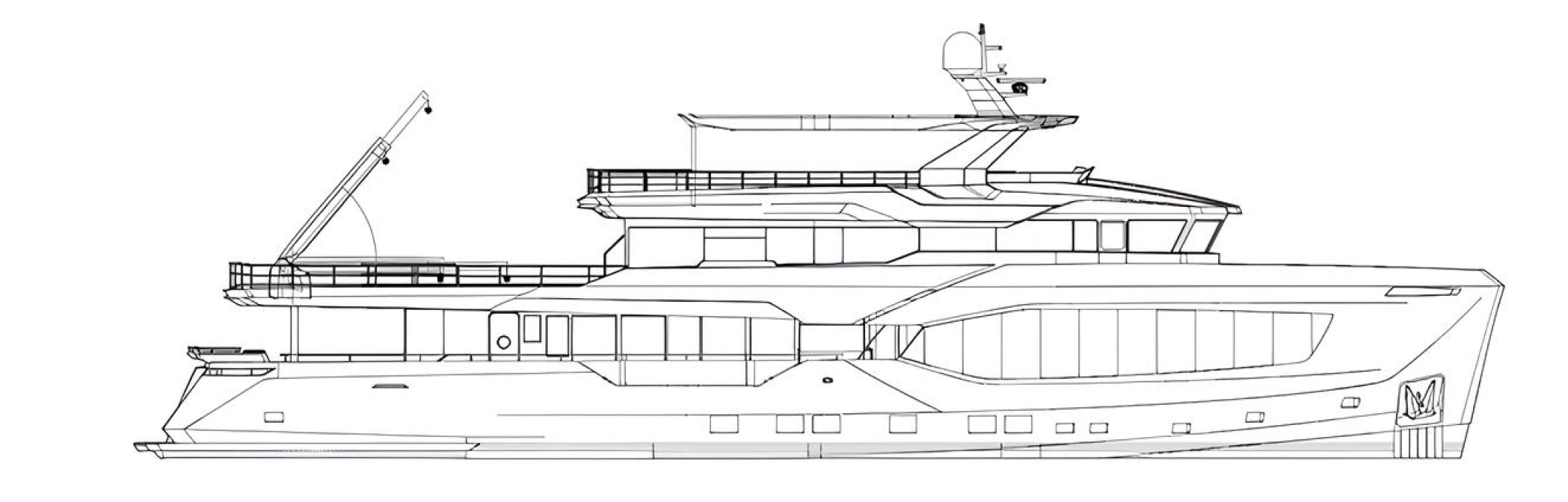 Her grey-painted steel hull is complemented by a composite superstructure. The deck is fitted with a 3-tonne crane to handle tenders and toys included with the yacht. Upgraded IMO Tier III engines and Atlas converters deliver a range of over 4,500 nm at cruising speed and up to 6,000 nm in economy mode.