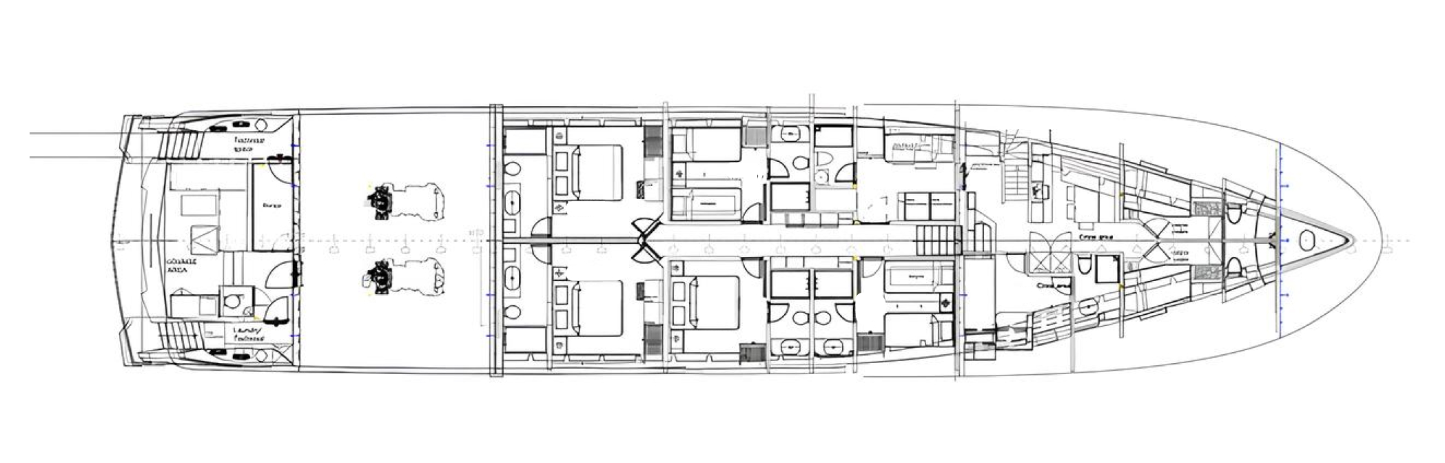 Crew accommodation includes eight berths plus a captain’s cabin on the upper deck, a dedicated crew mess, a professional laundry with six washing machines, and an additional berth with ensuite for extra staff.