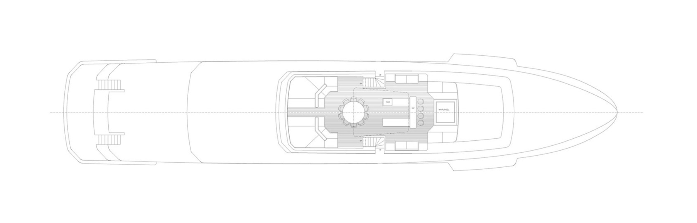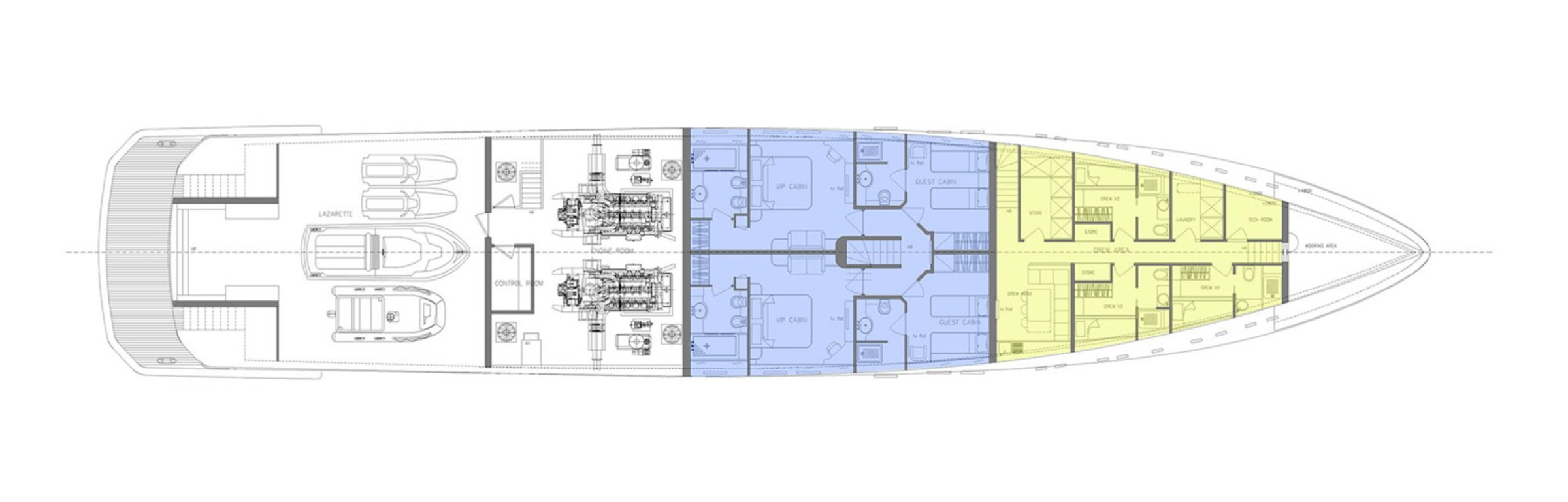 Accommodation is designed for 12 guests across six cabins. The owner’s suite, measuring approximately 37 m², is complemented by a private 12 m² terrace with panoramic views - a feature seldom found on yachts of this size. Crew quarters include four cabins plus a captain’s cabin adjacent to the wheelhouse, ensuring efficient operations and guest privacy.