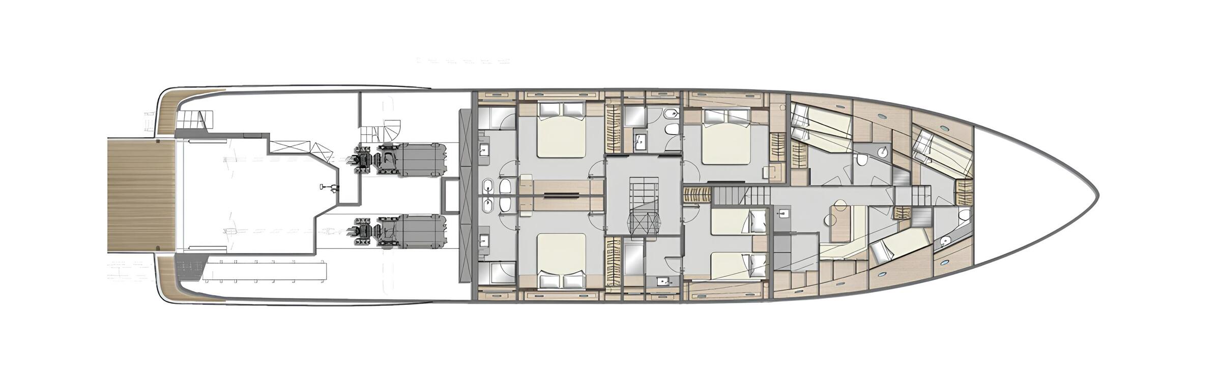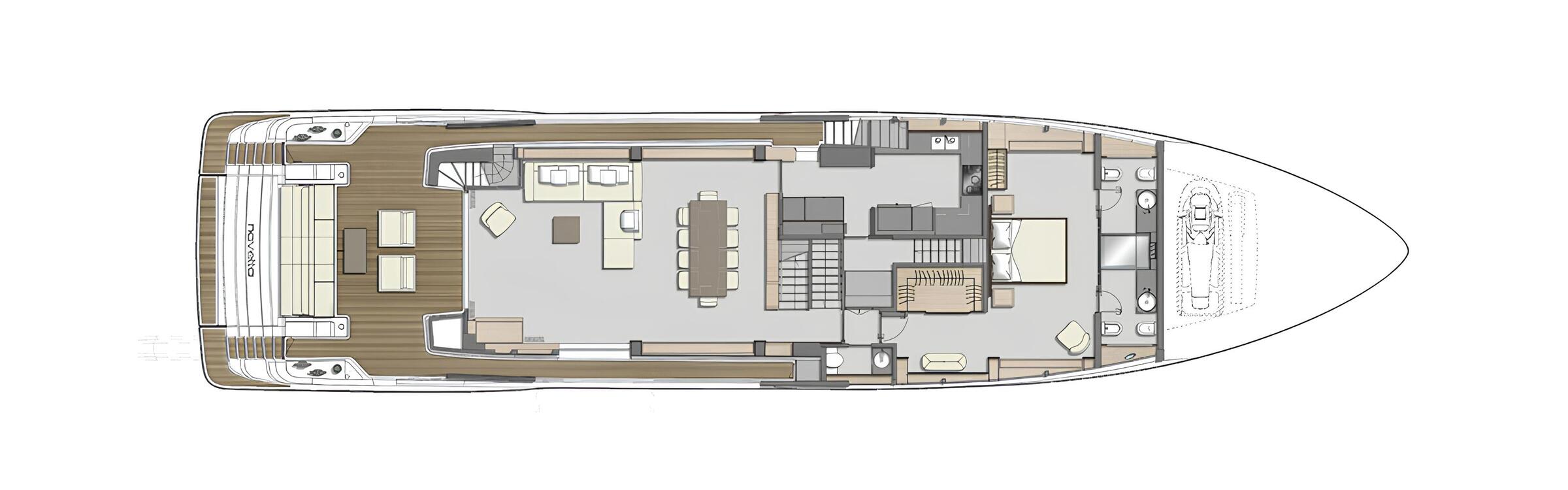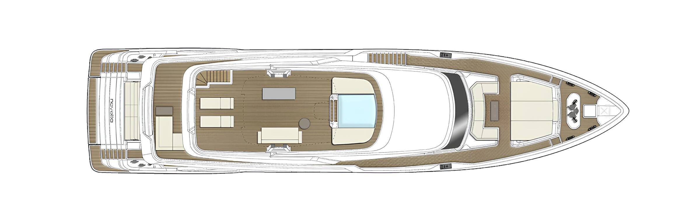 Her sky lounge is furnished with a designer Edra sofa, while the exterior decks feature Kettal and Tribù furniture. The sundeck doubles as an open-air gym equipped with TecnoGym SOLE SRVO gear, including treadmill, free weights, kettlebells and benches.