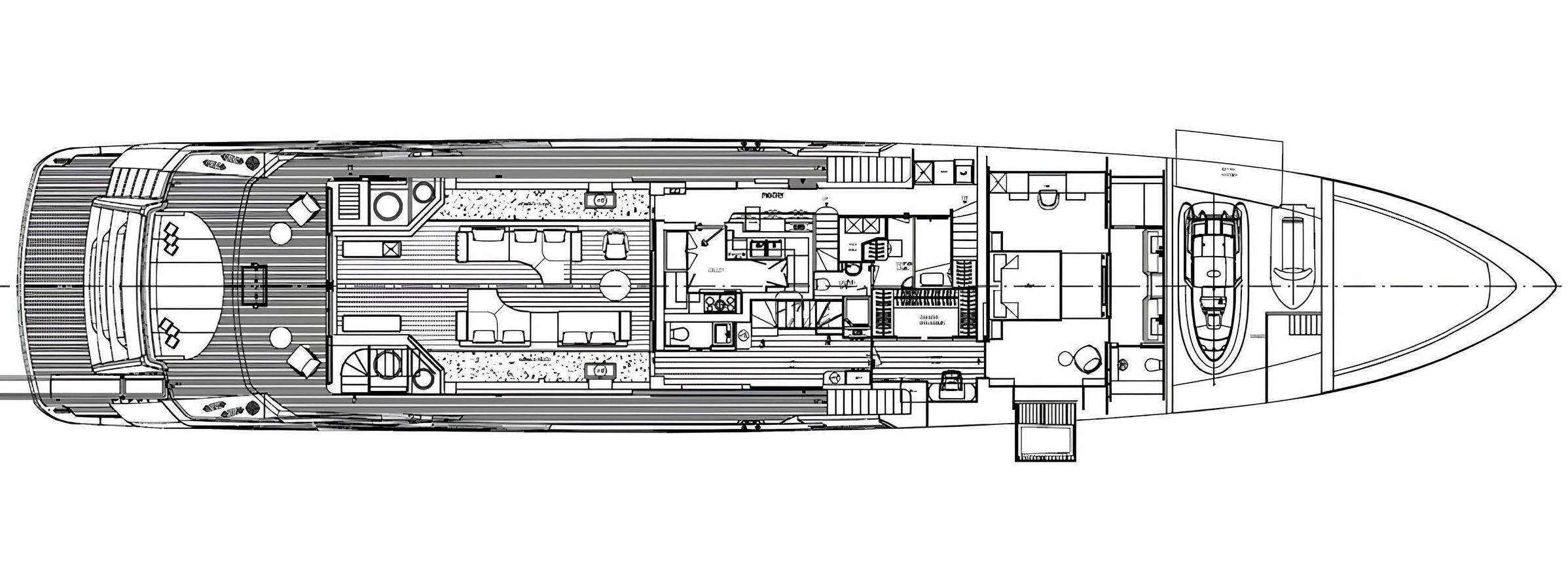 Her 75 m² beach club with fold-down platforms offers seamless access to the sea, tenders and water toys. When closed, the transom door reveals a bar and lounge area. Aft on the upper deck there is a Jacuzzi surrounded by sunpads, a bar and open-air dining, while the foredeck hosts a panoramic pool with sunpads and a private relaxation area.