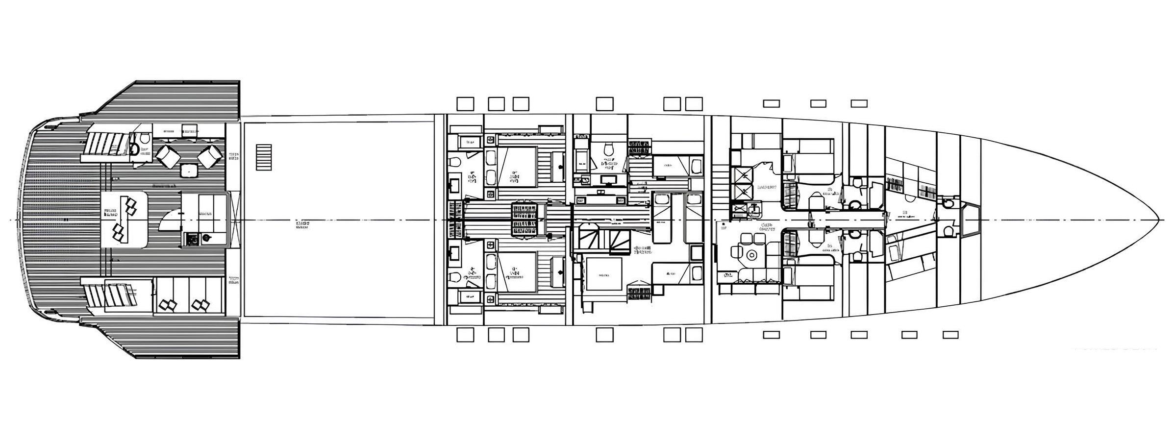 Accommodation is for up to 11 guests in five cabins, including a full-beam owner’s suite on the main deck, two VIP cabins on the lower deck and two guest cabins, one with an additional Pullman berth. All cabins have en-suite bathrooms. Crew quarters forward include four cabins.