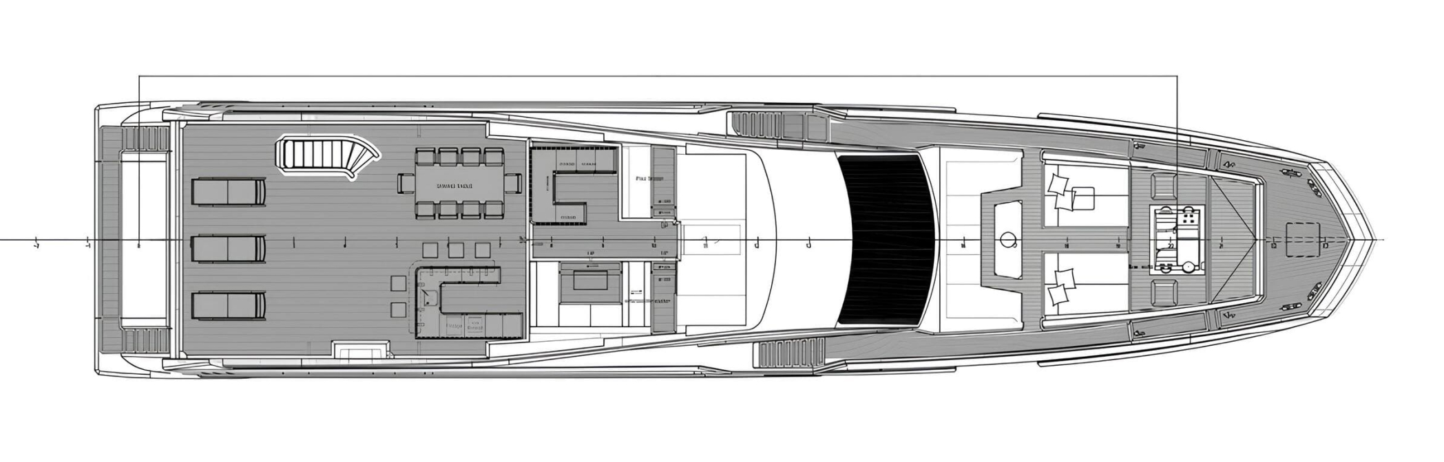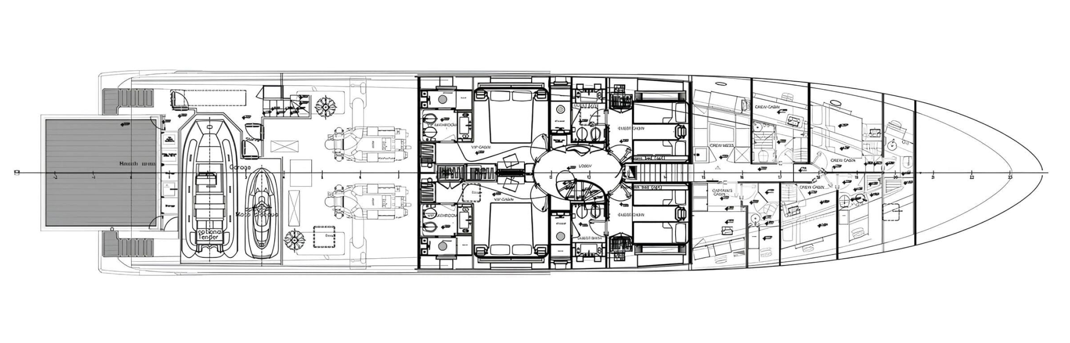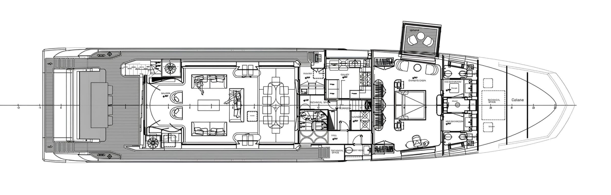 Powered by twin MTU 16V2000 engines producing 2,400 hp each, the yacht reaches a top speed of 25.5 knots and cruises comfortably at 18 knots. CMC Electra stabilizers ensure comfort both underway and at anchor.