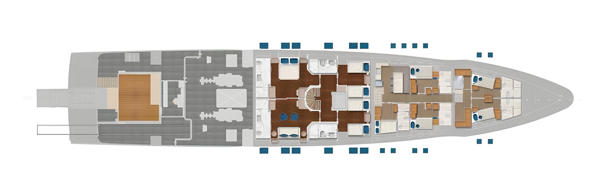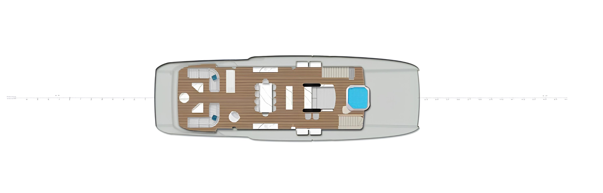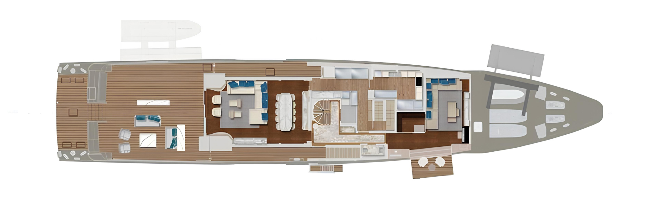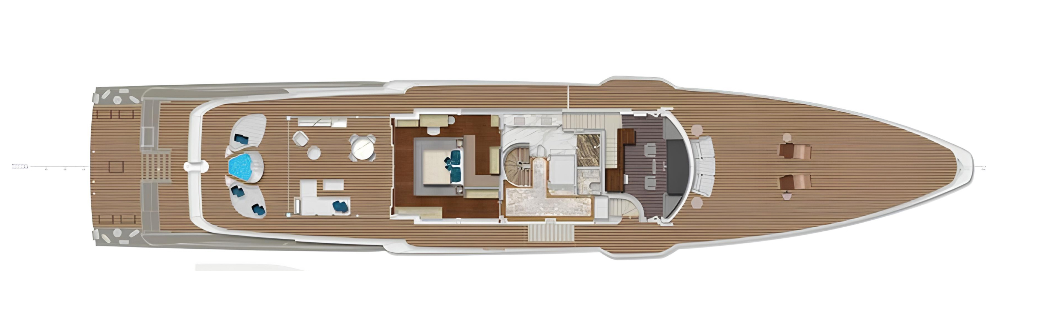 The upper deck aft hosts the owner’s suite, complete with a walk-in wardrobe, en-suite bathroom, and private terrace featuring a Jacuzzi, sun loungers, and dining area. The main deck offers a spacious salon and aft dining area, a guest lobby amidships, and a cinema with a retractable balcony and wine cellar forward. On the lower deck, there are four guest cabins: forward doubles with en-suite bathrooms and aft cabins that can be combined into a VIP suite. All decks are connected via central staircase and elevator.