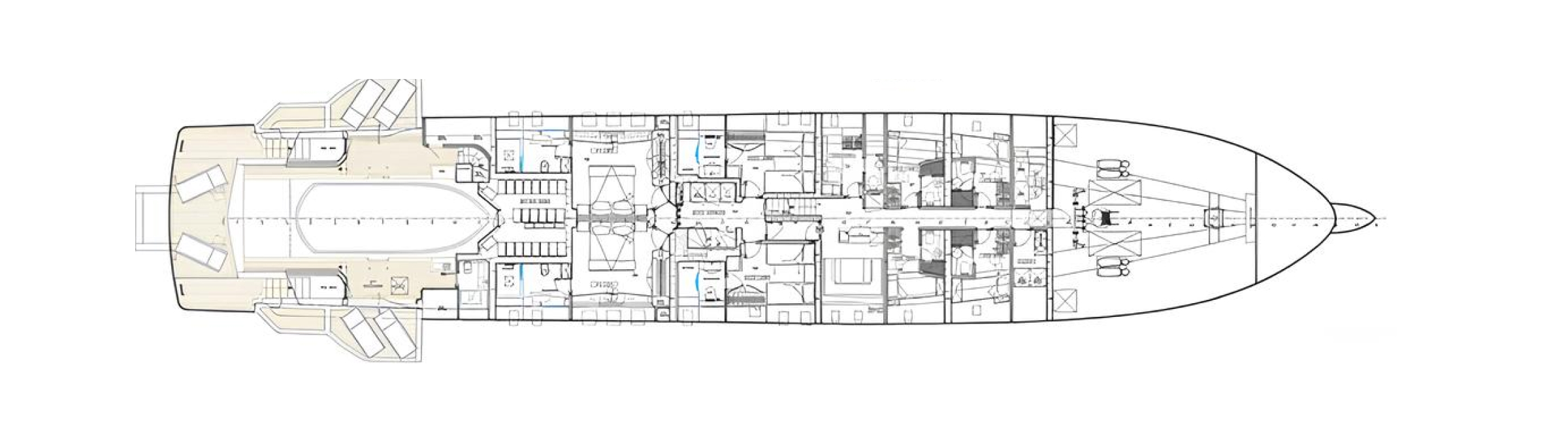 Accommodation is for 10 guests in 5 cabins, including a full-beam owner’s suite on the main deck with two fold-out balconies. The lower deck houses two VIP cabins and two guest cabins, all en-suite, along with a gym and sauna with direct access to the beach club.