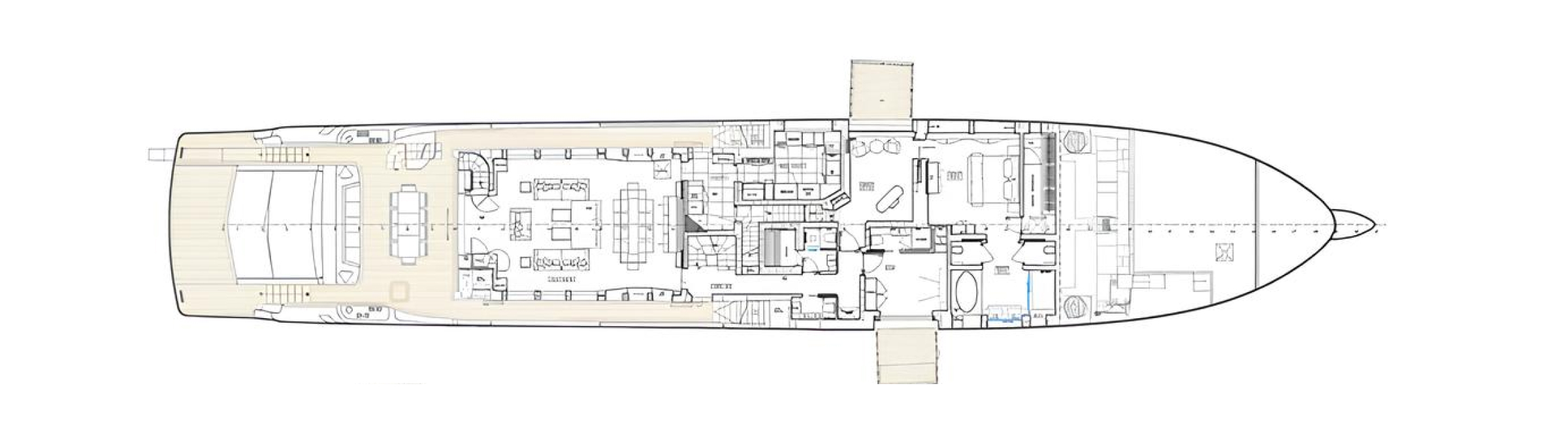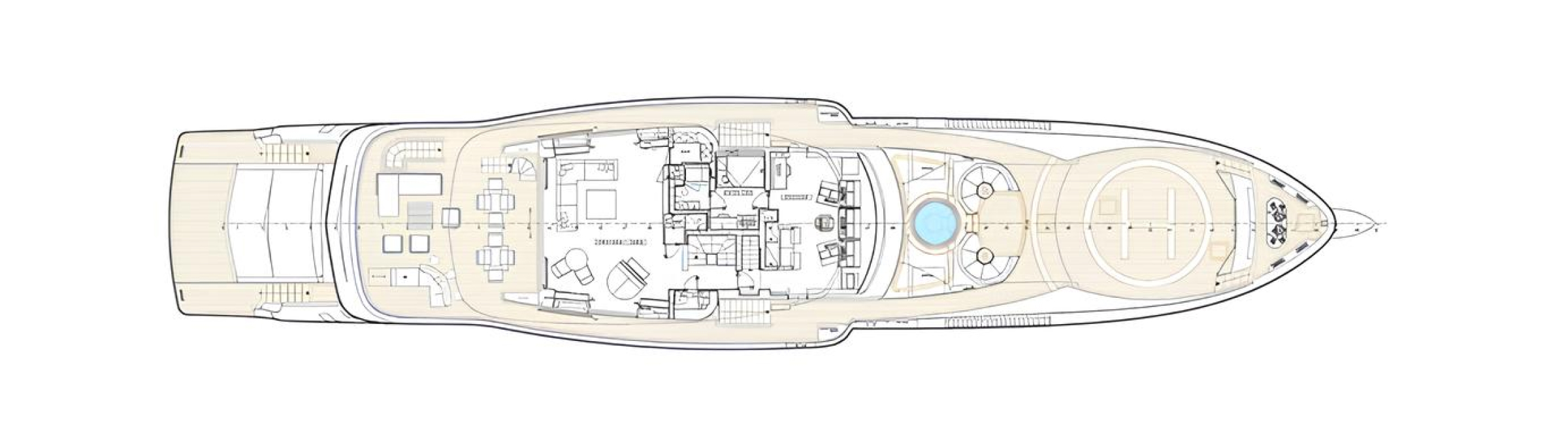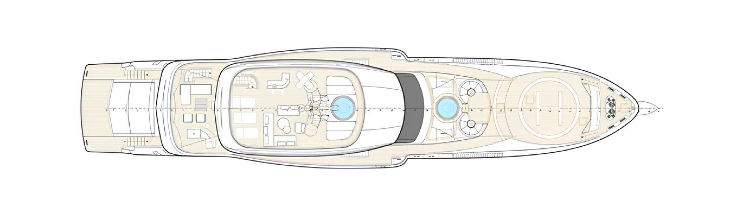 STERN’s exterior and leisure spaces are designed for ultimate enjoyment: a beach club with easy water access, a saltwater pool, two Jacuzzis, a touch-and-go helipad, and an aft garage. Lounges are located aft on the main deck and on the sundeck, while the upper deck aft features a spacious dining area.