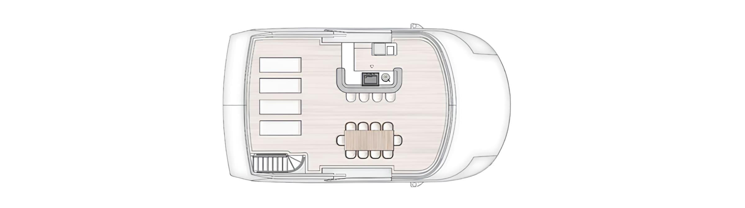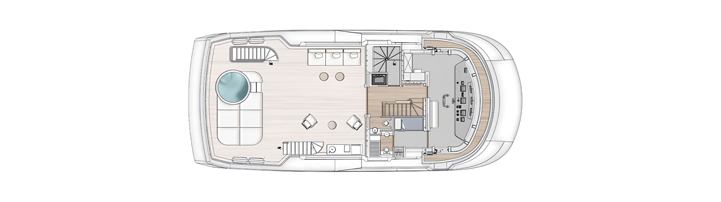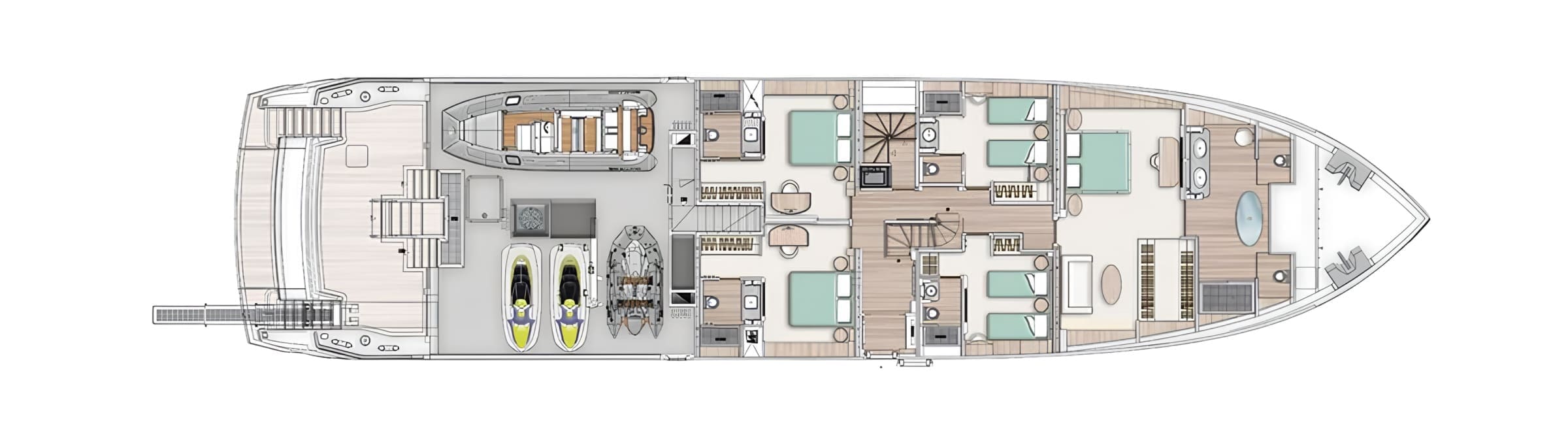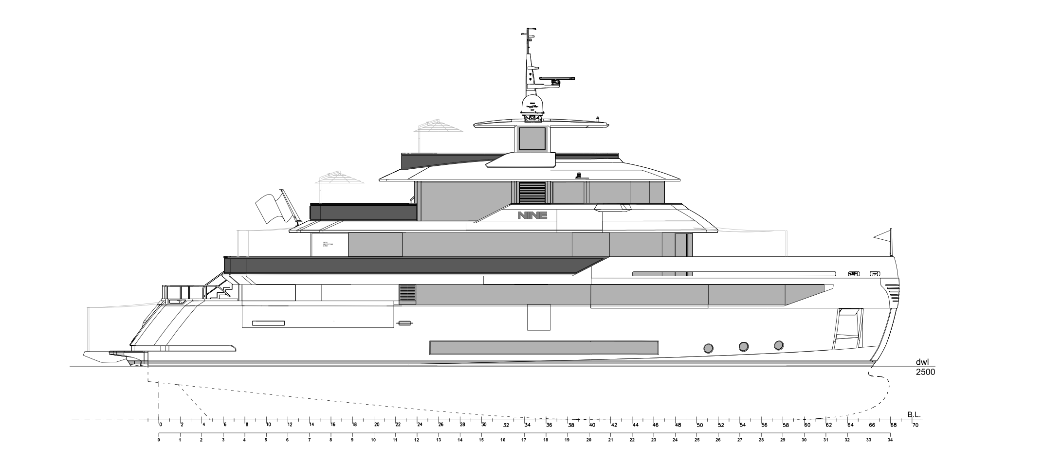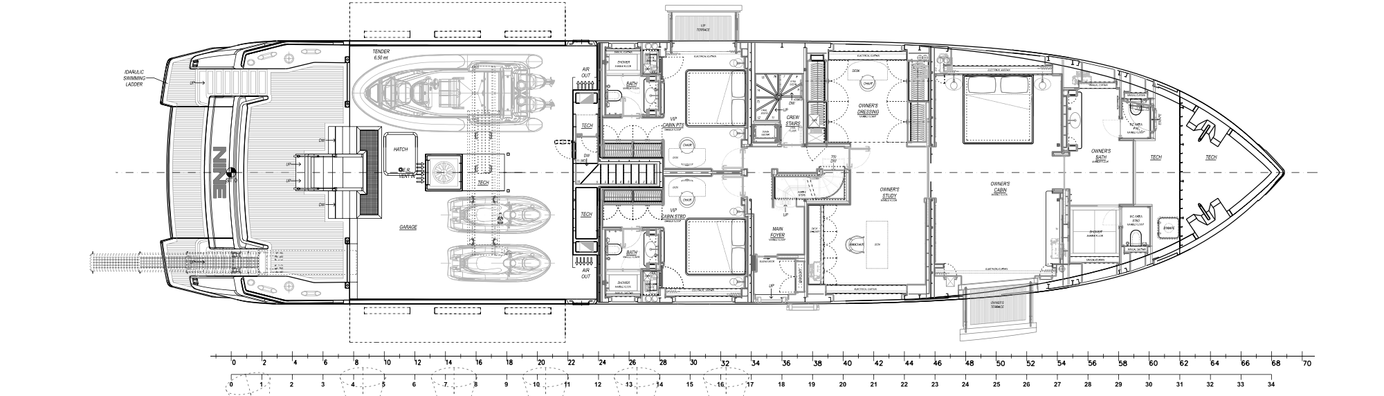 Accommodation is provided for up to 10 guests in five cabins, with quarters for nine crew including the captain’s cabin on the upper deck. The garage accommodates a 6.5-metre tender and two 300-hp jet skis.