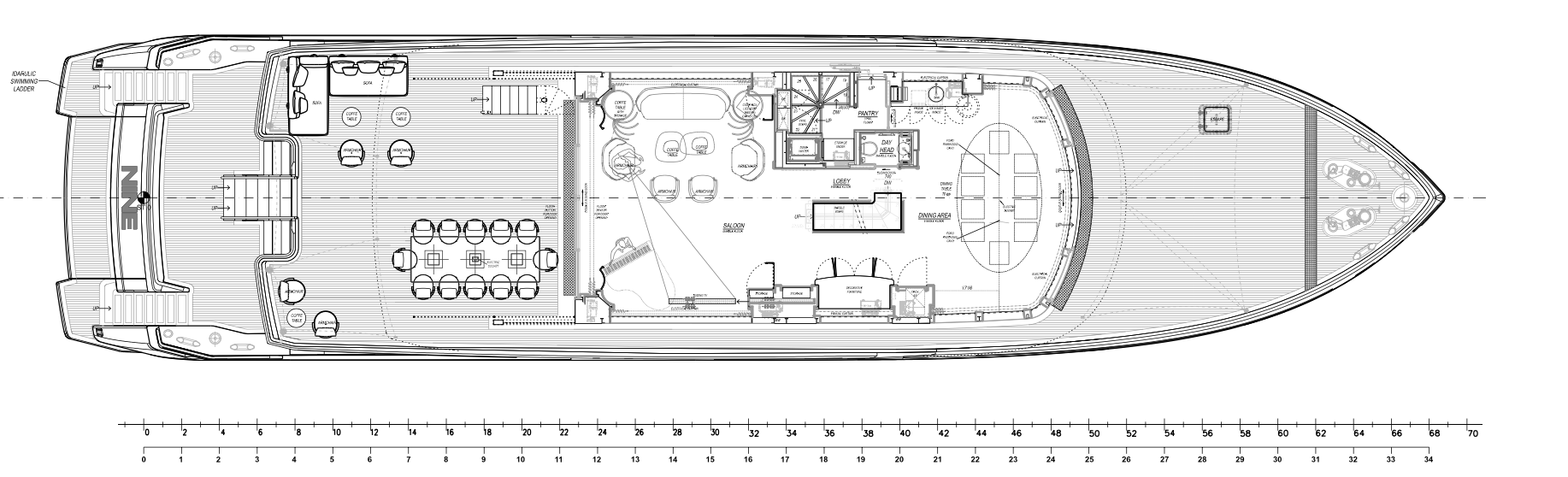 Her innovative layout offers an impressive interior volume of 420 GT. The aft terrace on the upper deck has been transformed into a private spa area with a sauna and steam room. The owner’s apartment combines a master suite and two guest cabins with a private fingerprint-access entrance, marble floors, a fold-out balcony and an enlarged shower. Colorado Gold and Portoro marbles accent the interior décor.
