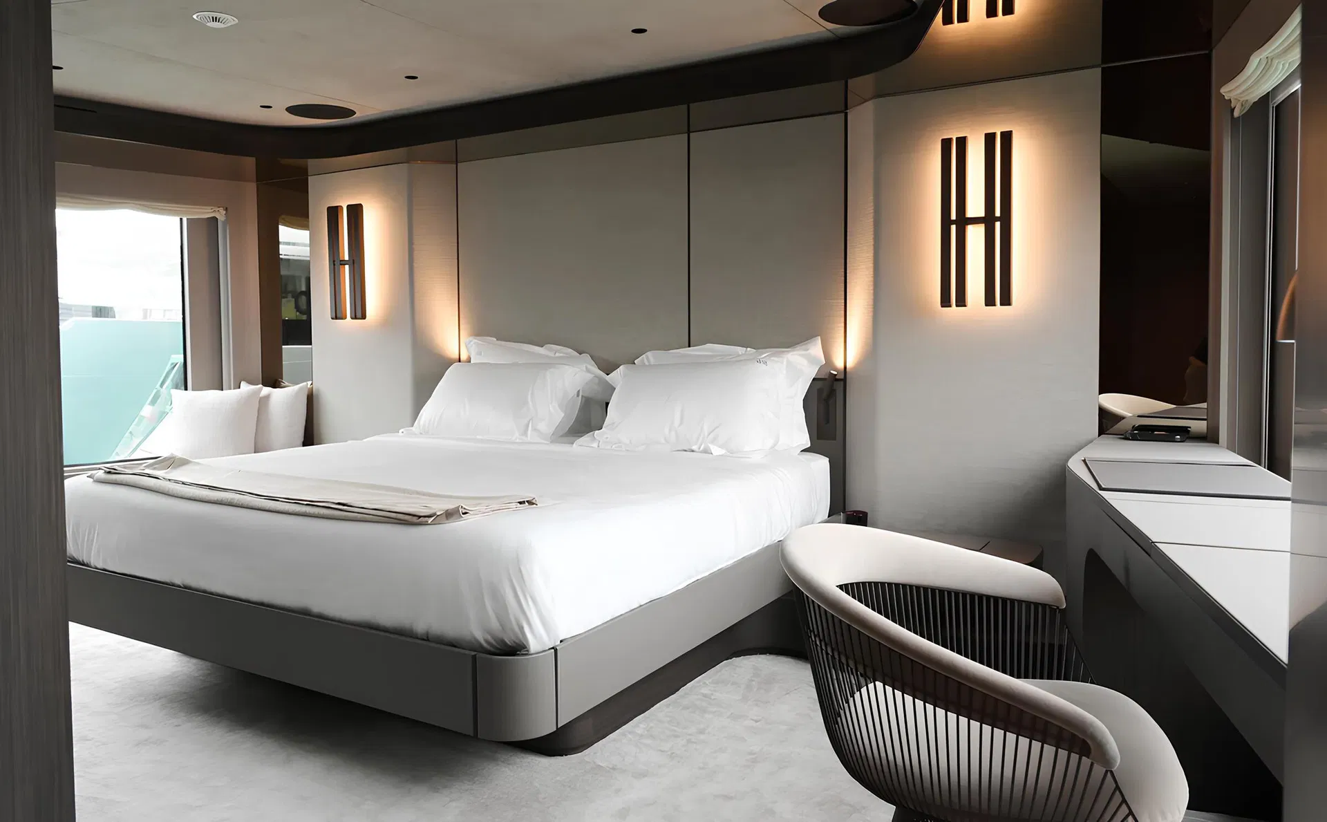 Master cabin on the main deck with panoramic windows, offering open sea views directly from the bed