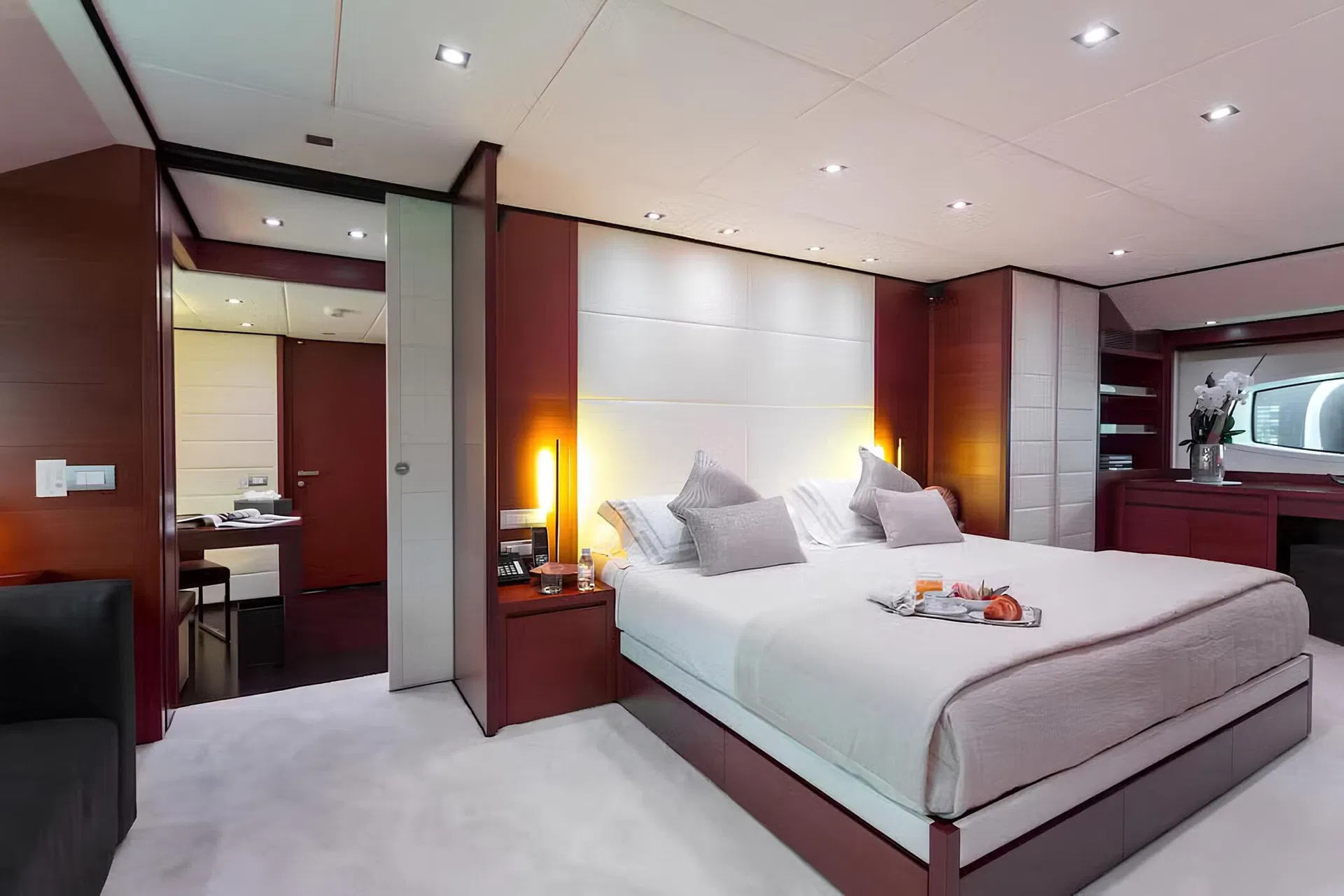 Full-beam master suite on the main deck featuring private office, walk-in wardrobe and jacuzzi bath