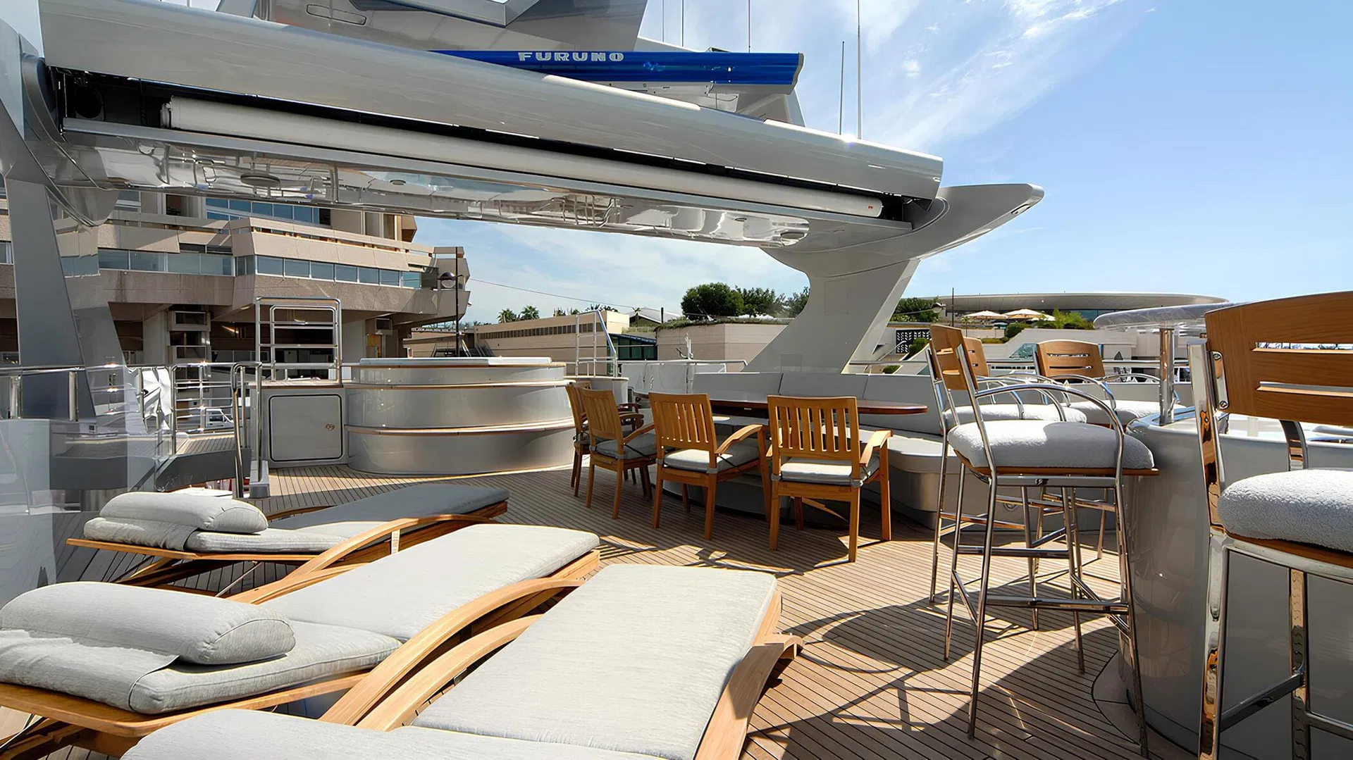 Expansive sundeck with jacuzzi, bar and generous sunbathing areas