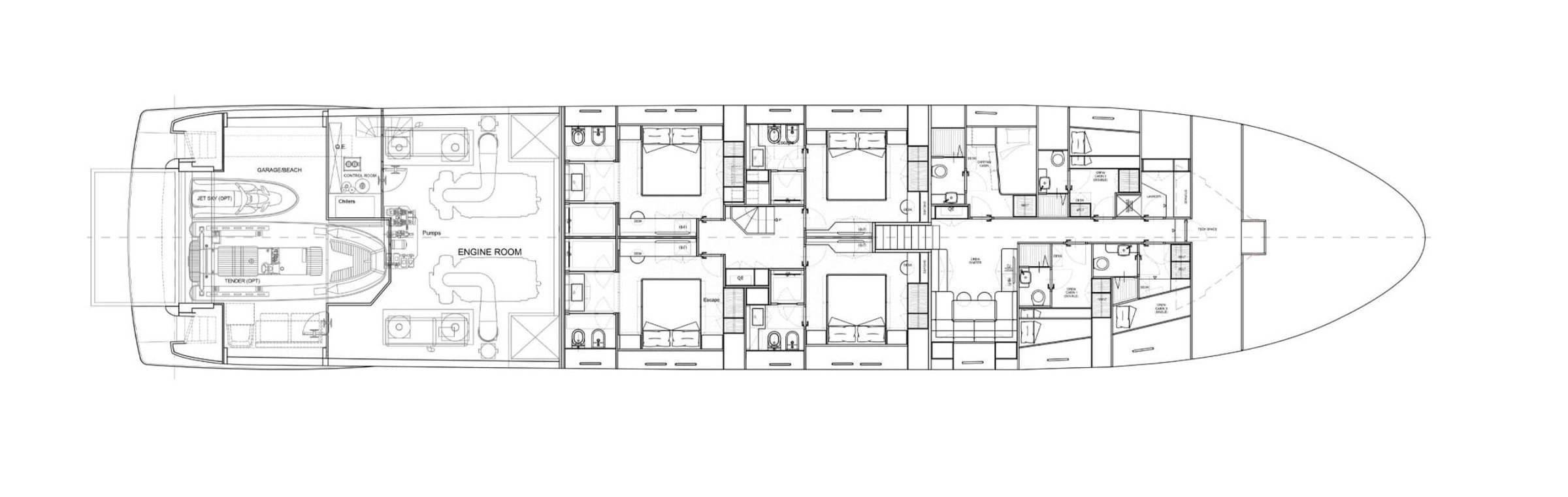 Accommodation is designed for up to 12 guests across five suites, including the master. The lower deck houses two double cabins and two twin cabins, each equipped with an additional Pullman berth to suit families or mixed groups. An eight-member crew delivers attentive service and ensures smooth operation throughout the yacht.