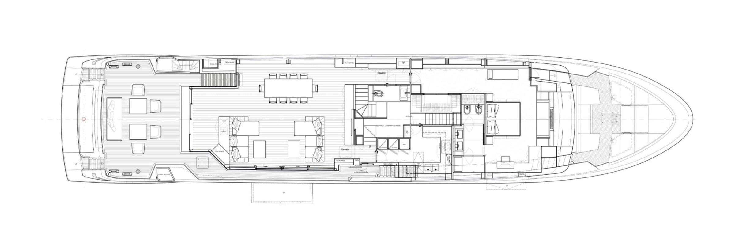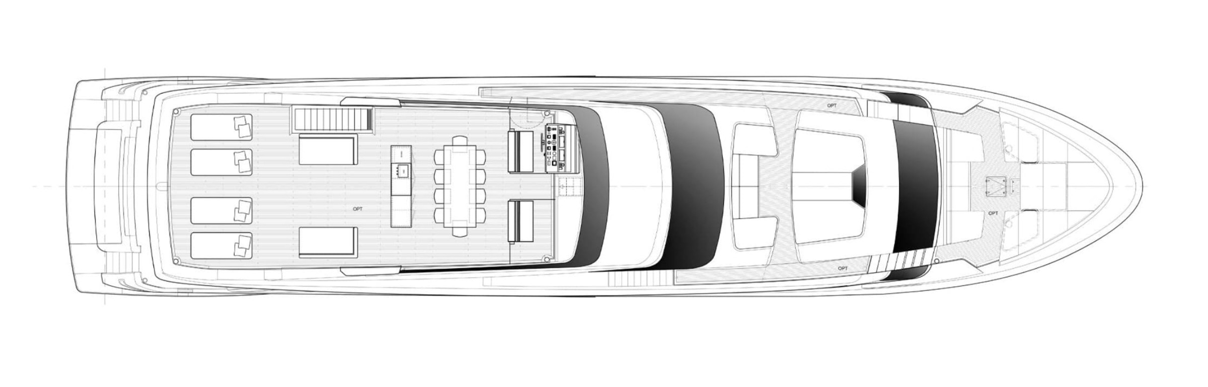 The exterior spaces aboard ARESYA are arranged to support a variety of lifestyle scenarios. A pair of terraces flank the aft garage, while the hydraulic transom lowers to create a generous beach platform at water level. The flybridge provides a calm, elevated retreat for daytime relaxation, equipped with a grill and sun loungers. Forward, a dedicated bow lounge connects seamlessly to the owner’s suite, forming a private relaxation zone.