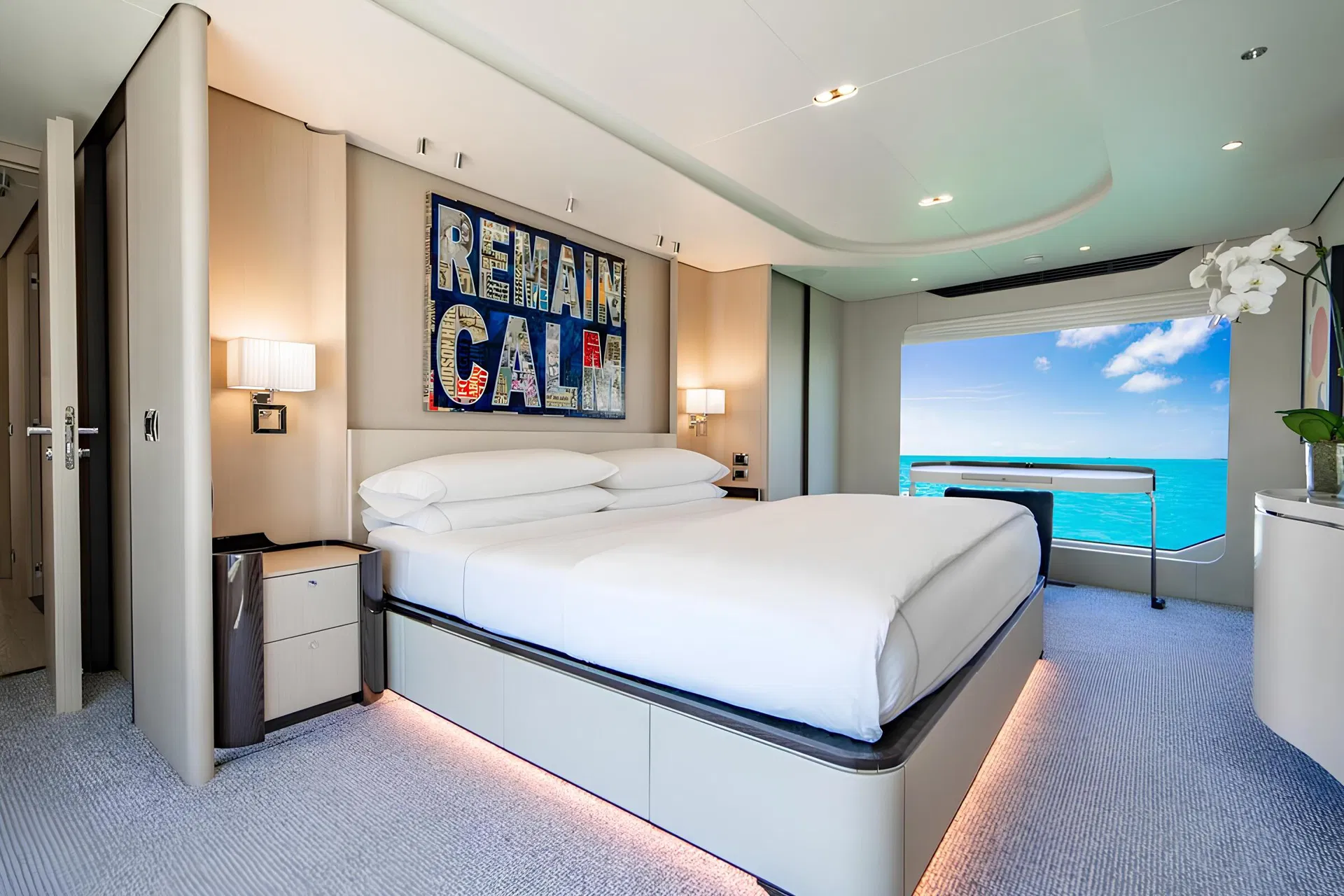 Master cabin on the main deck with floor-to-ceiling windows and a spacious walk-in wardrobe