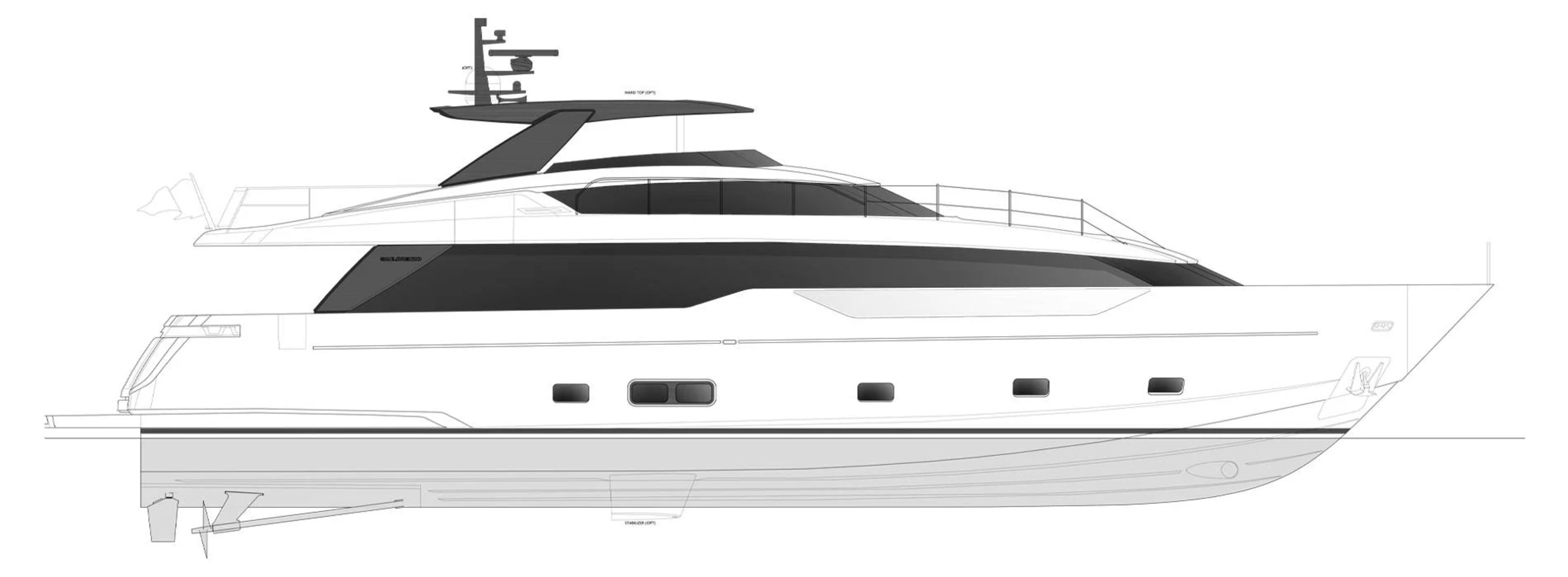 The flybridge, fitted with an electric hardtop, offers an eight-person dining area, bar, sun loungers and outdoor furniture by Roda and Paola Lenti. The foredeck features an additional lounge and sunbathing area, while the aft deck includes a hydraulic swim platform for easy access to the water and toys.