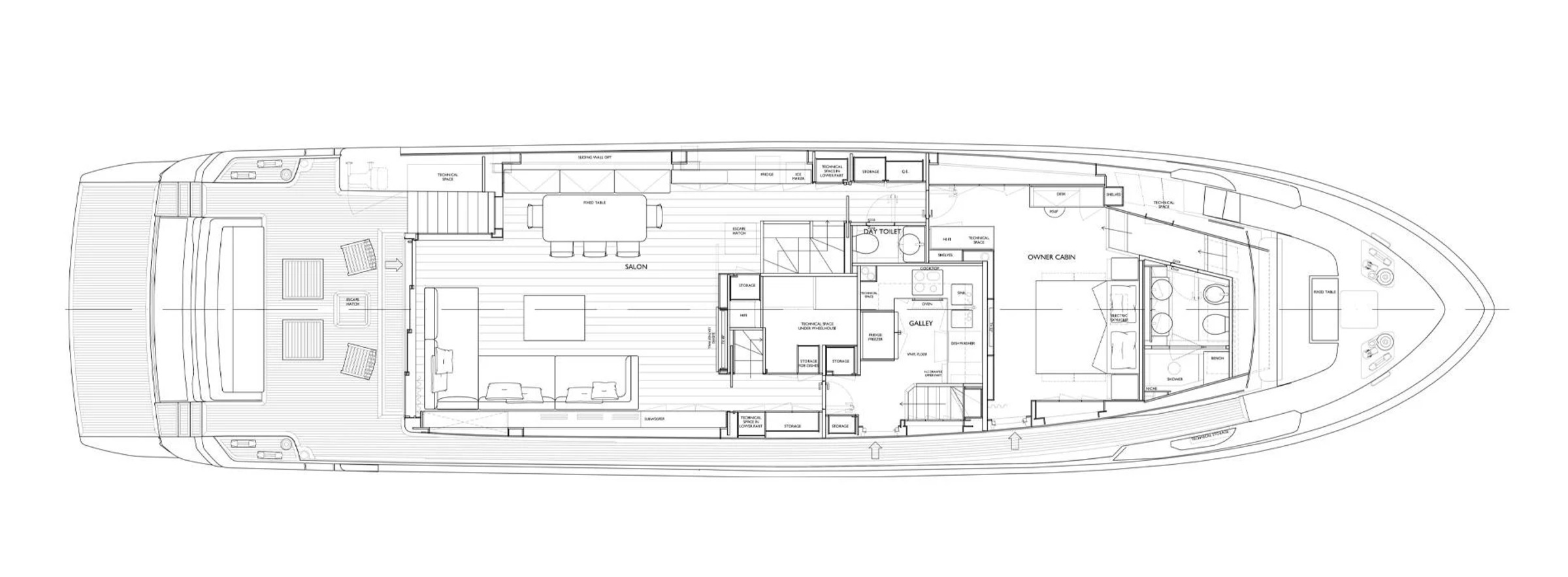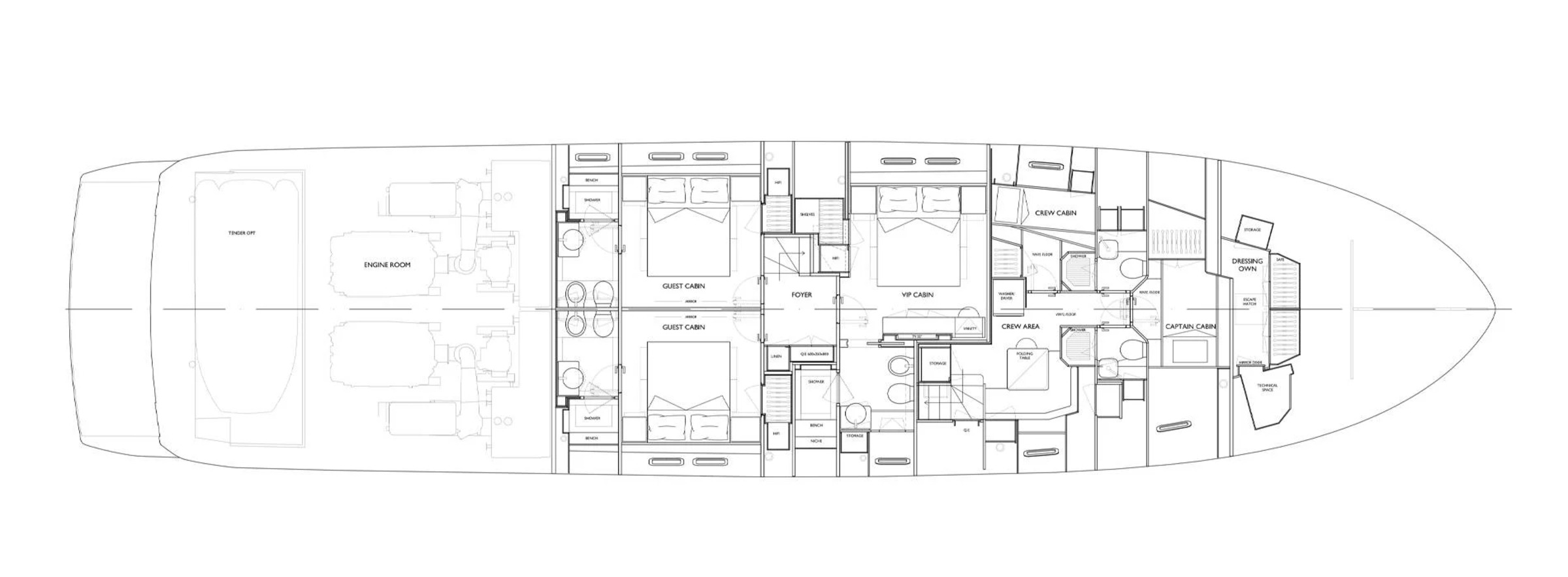 Accommodation is designed for eight guests across four cabins. The full-beam master suite sits on the main deck and includes a king-size bed, walk-in wardrobe and an electric skylight. The lower deck hosts a queen-size VIP cabin and two double guest cabins, all finished in the yacht’s unified interior style. The crew of four is housed in a separate area, ensuring privacy and efficient service.