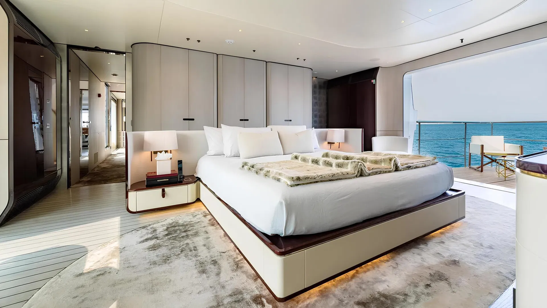 Master cabin on the main deck with panoramic windows and private fold-down balcony