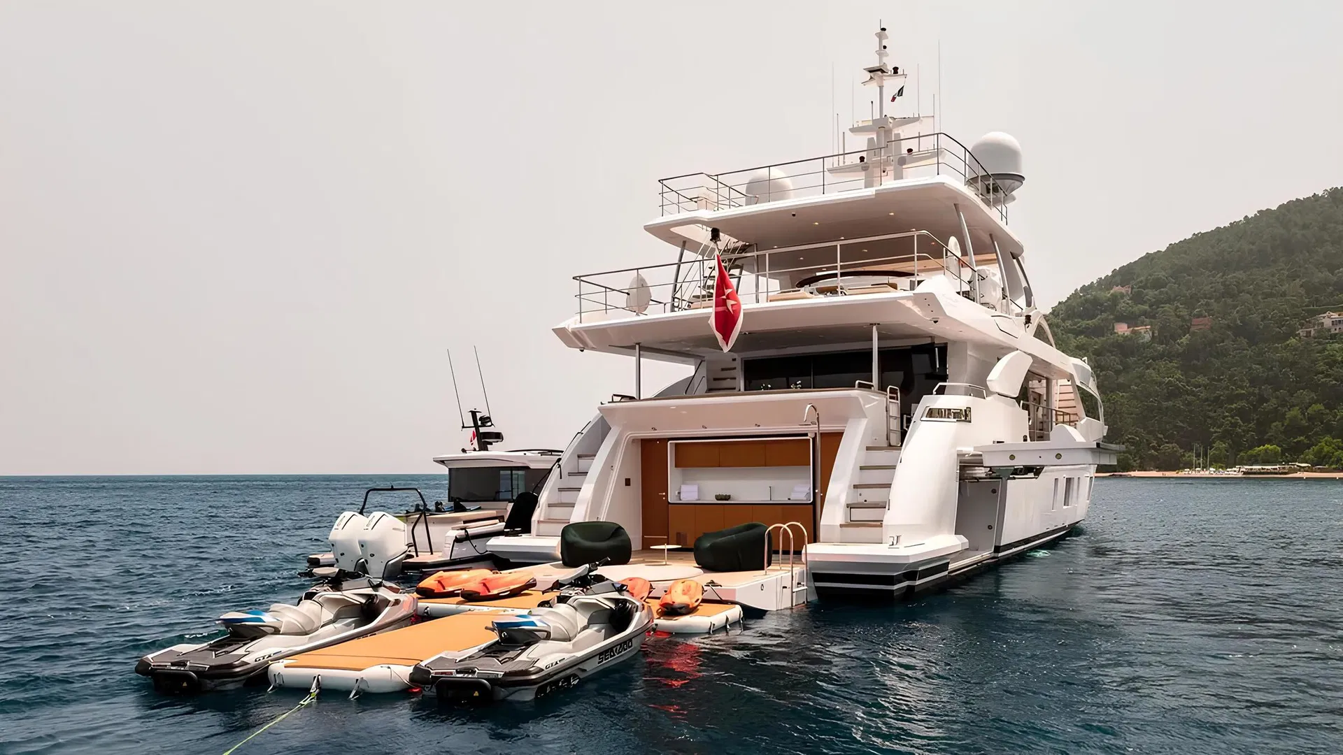 Beach club plus inflatable swimming platforms expanding the waterside space. Extensive selection of water toys, including tender and 2 jet skis.