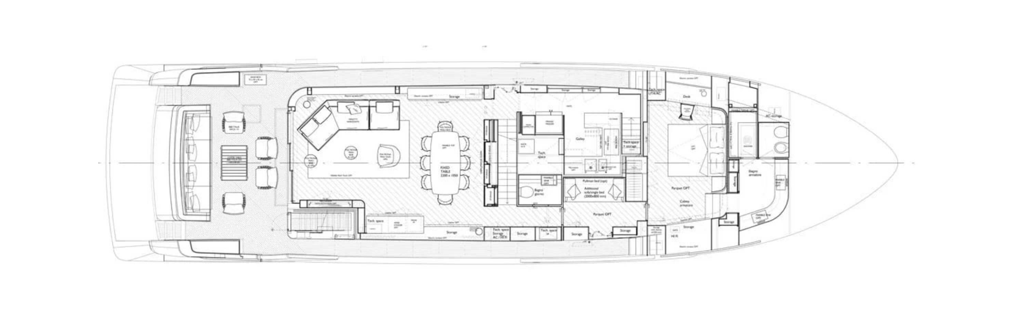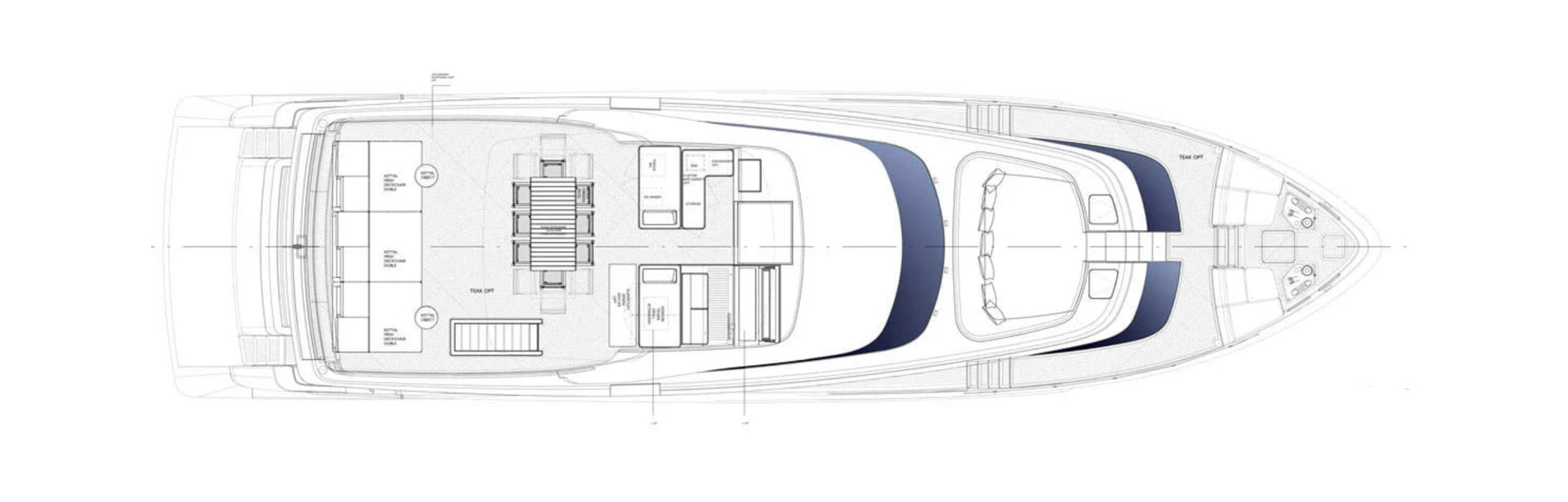 The main deck hosts a spacious salon, a fully equipped galley, and an aft cockpit for alfresco dining. The flybridge and foredeck provide open-air spaces for relaxation, dining, and sunbathing with panoramic views.