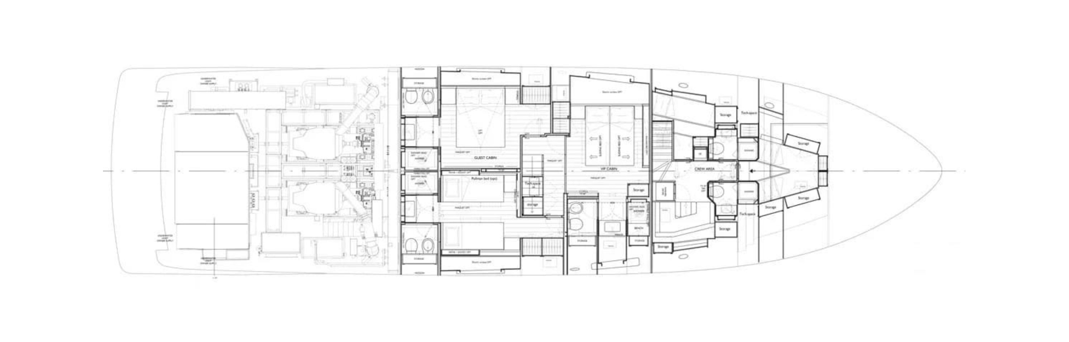 PENGUINS accommodates up to 10 guests in four cabins: a full-beam owner’s suite on the main deck and three lower-deck cabins — a VIP and two doubles, one with an additional Pullman bed. All cabins feature ensuite bathrooms.