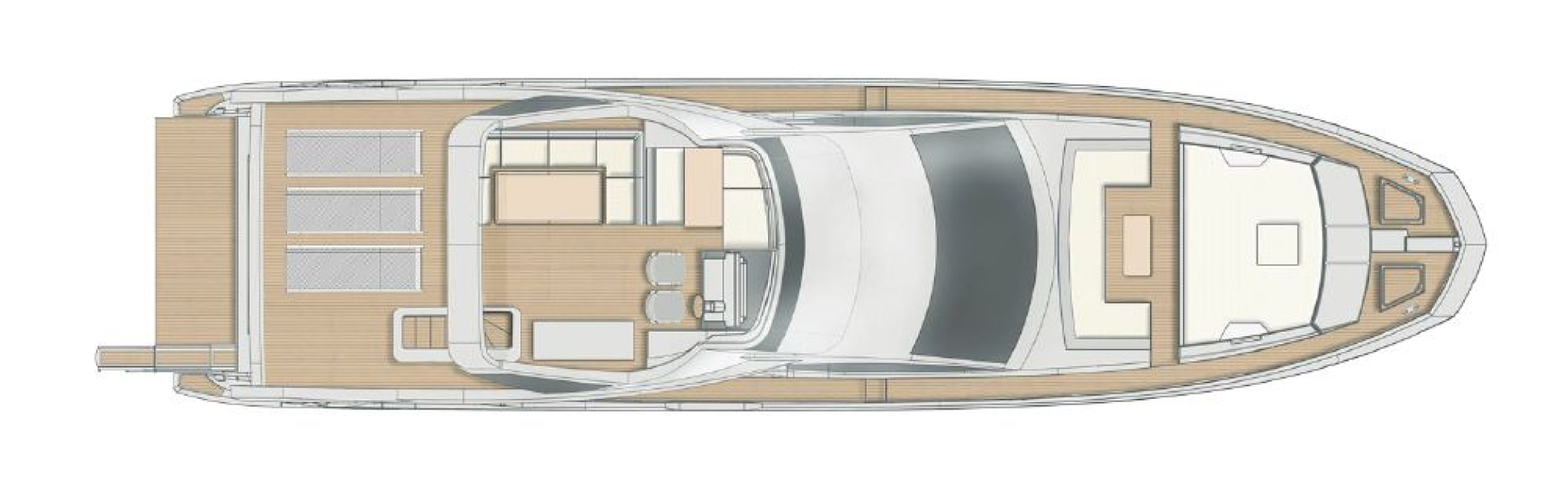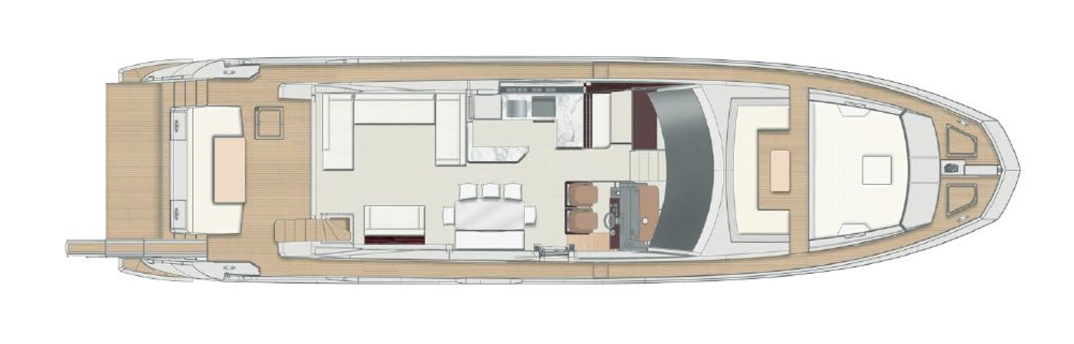 The upper deck aft extends into a large living space, ideal for relaxation or social gatherings, complemented by a casual dining area perfect for al fresco meals.
